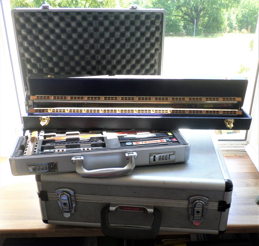 Auch die große Akkordmundharmonika (60 cm) paßt in keinen der Koffer mehr rein. Und der Flötenkoffer ist schon voll und kommt auch nicht immer mit.