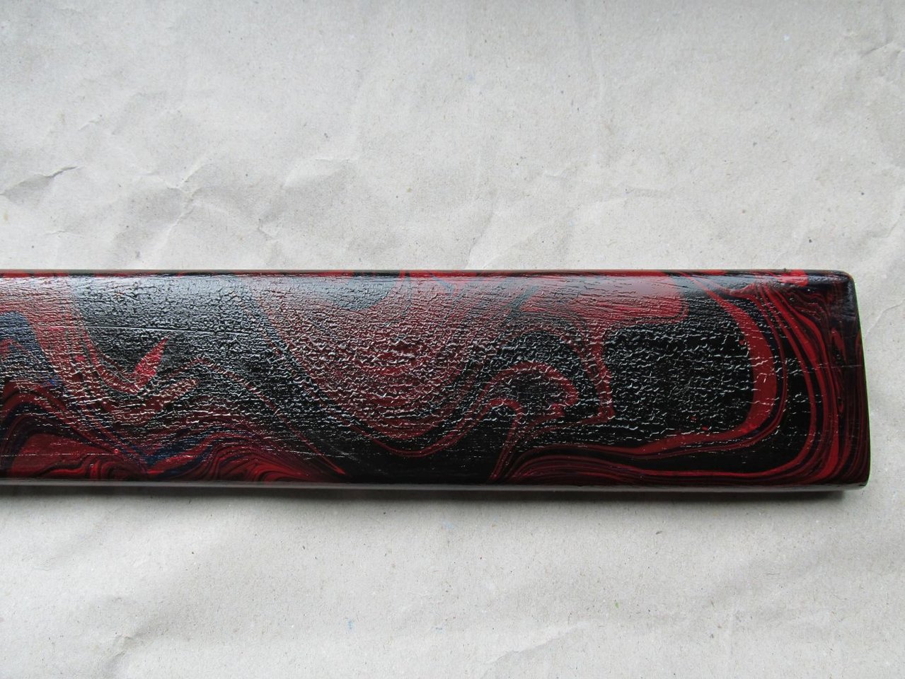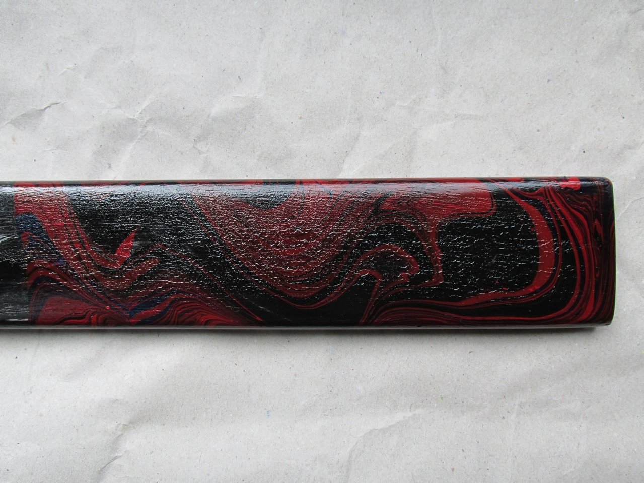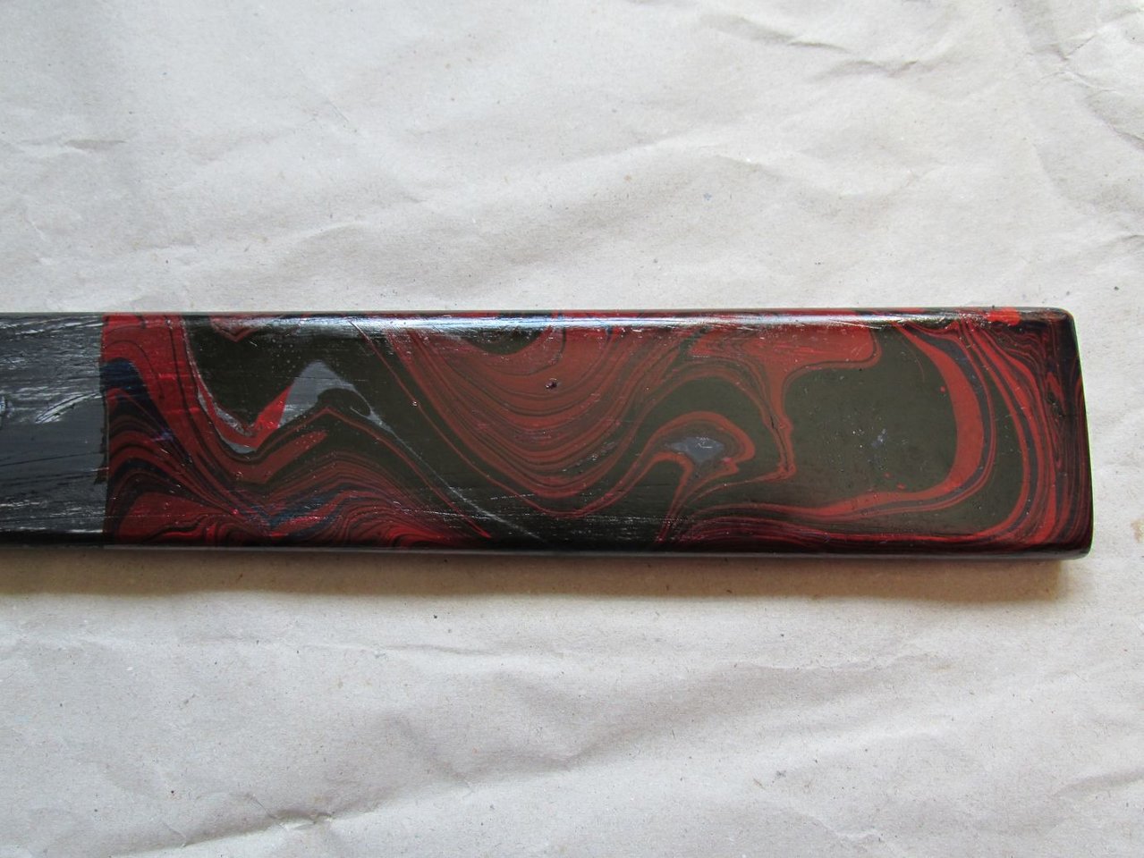 Ich hatte die Farbe vorm Swirldurchgang nochmal angeschliffen, wobei ich mehrmals bis zur Grundierung durchgeschliffen hatte. Deswegen schimmern immer noch ein paar gräuliche Stellen durch die Grundierung und außerdem haben sich wieder ein paar kleine Pickel gebildet, obwohl ich das Brett vorher gut abgewischt hatte. Gut zu sehen sind auch ein paar Stellen, bei denen der Farbfilm auf dem Wasser aufgerissen ist und somit nur die schwarze Grundierung vorhanden ist. An den Stellen sieht das Schwarz eher gräulich aus und deswegen werde ich alles nochmal mit 'ner Schicht Klarlack versehen, um zu sehen, ob das Grau wieder zu 'nem Schwarz wird.