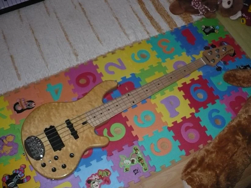 Hier mal auf die Schnelle drei Fotos von meinem 55-94. Body Sumpf Esche mit Wolken-Ahorndecke in Tobacco-Sunburst; 3,7 kg Gewicht!!! Ahorn Hals 35“ mit Griffbrett aus Vogelaugenahorn. Lakland Pickups mit 3 Band aktiv Elektronik. Original Lakland Hardcase.