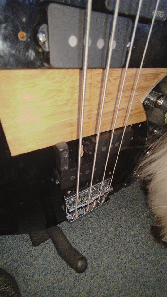 Hab da aktuell noch eine Daumenstütze angebaut, da ich sonst zu weit an der Brücke war beim Anschlagen der Saiten. Da hat sich gar kein Ton entwickelt.