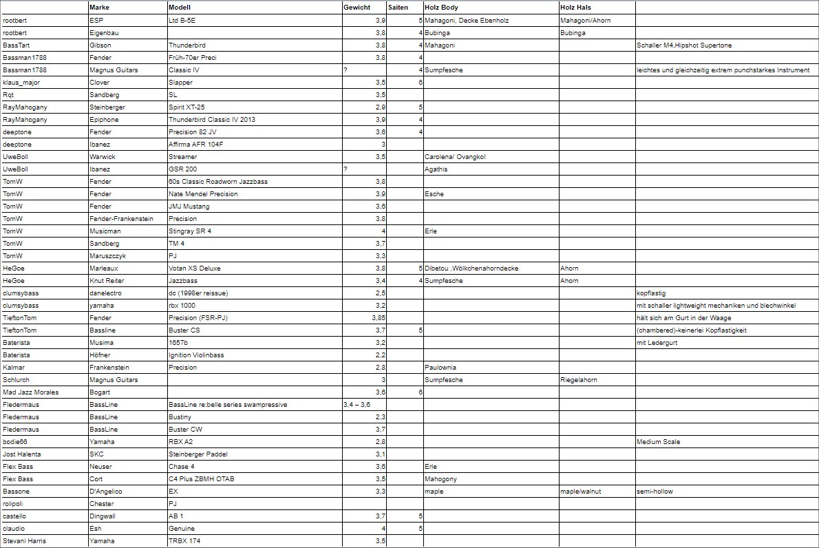 Hier wirds zugegeben schwierig. In der Liste oben sieht man ja schon die verschiedensten Bässe, auch "traditionelle" Bässe mit den Standardhölzern.