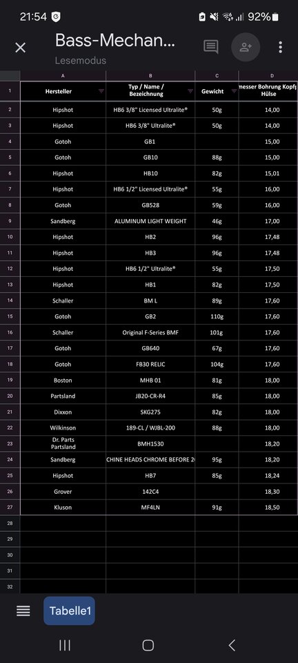 Ich habe mir letztes Jahr einen sehr schönen Frankenstein P-Bass gebaut. Dass ich beim Body absichtlich aus Ergonomie- und Gewichtsgründen großzügig Holz abgeschliffen habe, hat funktioniert und der Bass ist insgesamt ziemlich leicht. Leider ist er aber mit dem Preci-Hals, den ich drin habe auch recht kopflastig, obwohl ich die Kopfplatte so klein wie möglich gemacht habe. Ich kann also noch bei den Tunern nachhelfen, die sehr billig waren und ungefähr 85g pro Mechanik wiegen. Nun gibt es seit Ewigkeiten endlich wieder die Gotoh GB350 in der Links-Ausführung bei Thomann und da nach meinen Foren-Recherchen das die mit Abstand leichtesten Mechaniken sein sollen, würde ich sie liebend gern verbauen.