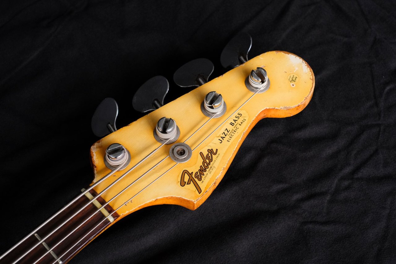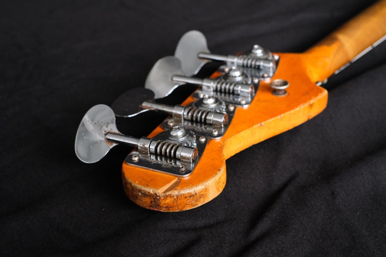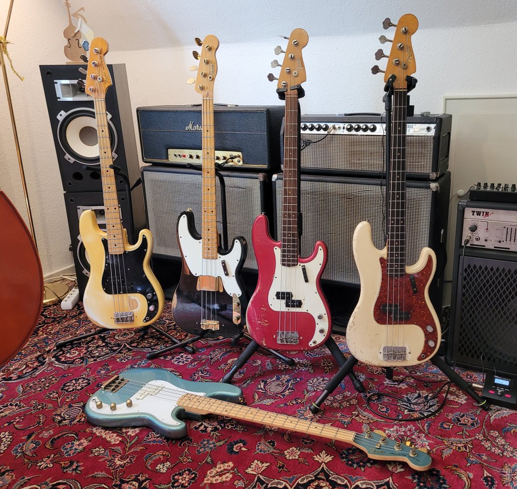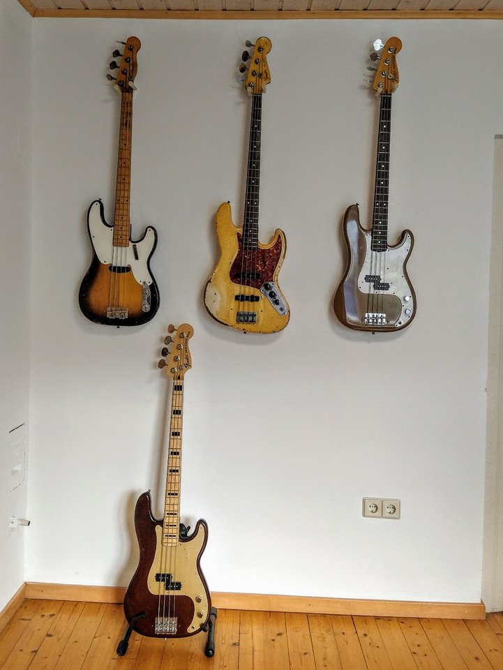 Ein Jazz Bass, der vom Erstbesitzer aus Irland über @grdIbrmpf zu mir kam. Baujahr zweite Hälfte 1965, daher schon mit Fender-eigenen Lollipop Tunern (rechtsdrehend). Er wurde neu bundert, ansonsten ist alles original. Der Bass wurde intensiv benutzt und tourte durch die ganze Welt, was man ihm nicht nur ansieht, sondern auch hört. Sowas Resonantes, so ein befreiter, ungehemmter, offener Ton wie bei diesem J ist einem noch nie begegnet. Höchstens noch bei einem roten Sechziger Precision, den ich auf einem früheren Treffen mal das Vergnügen hatte hören zu dürfen.