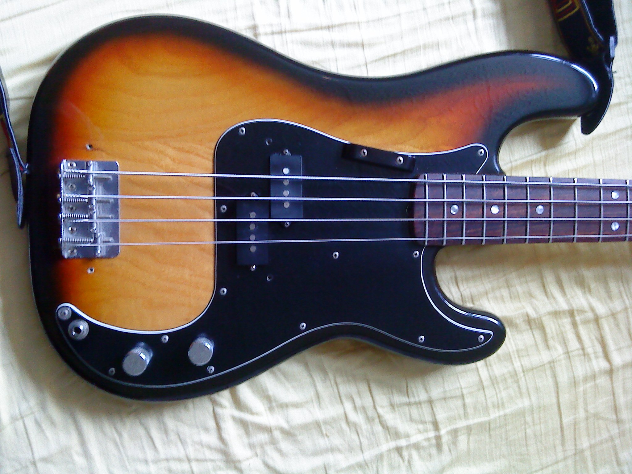 Die Maserung von deinem JB sieht irgendwie merkwürdig aus, finde ich. Die Streifen verlaufen so gleichmäßig gerade, kenne ich von Esche so eigentlich nicht. Bei mir ist die Maserung irgendwie wilder, guckst du:Wobei das mit Erle auch geht - mein Preci ist Erle/Butterscotch.