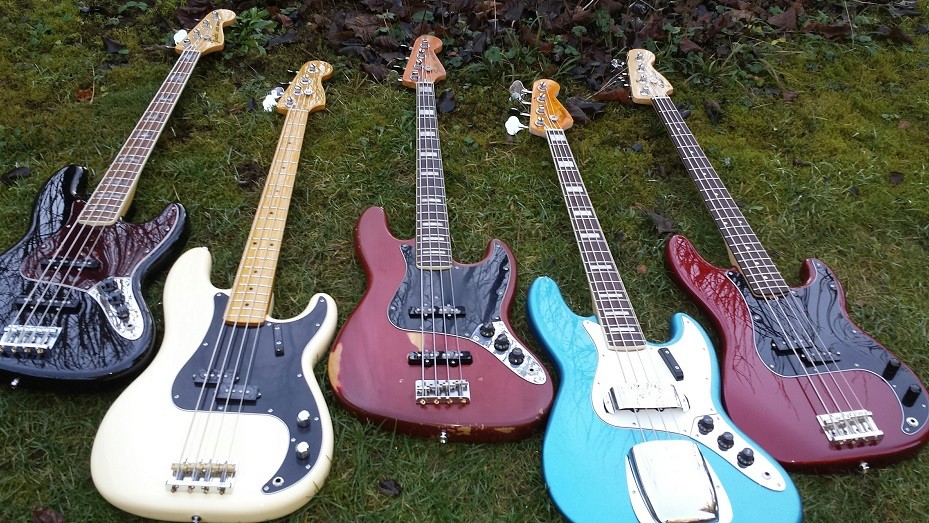 Hier haben wir einen Mexiko-Preci in candy-apple-red (plus schwarzes Pickguard, AWM-Bridge und Fender Original-PUs) ... ein Nate-Mendel-Light sozusagenis das ganz rechts candy cola oder midnight wine oder wie dit heißt?
