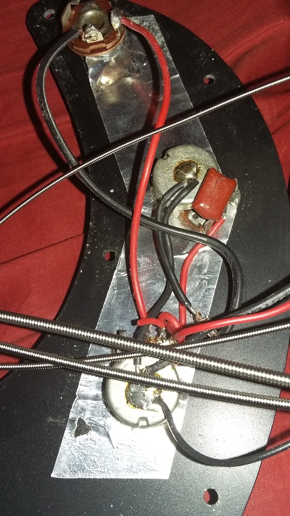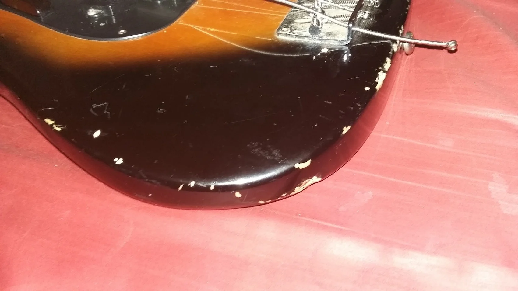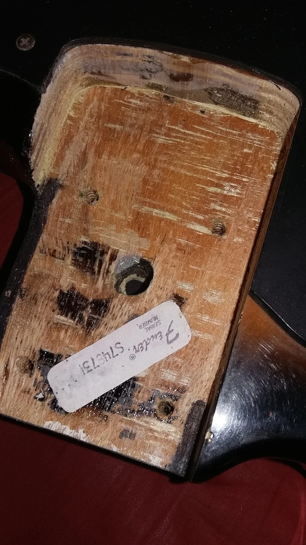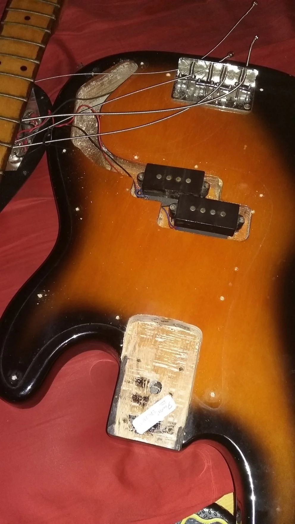 Das ist kein Fenderbody.So liebe LEOs, da will mich jemand glaube ich verarschen. Da habe ich mir einen Fender Precision 1977 in sunburst zugetan, wohlwissend, dass Pickups und Bridge nicht original sind. Ich habe nämlich noch PUs von einem 77er Preci und dachte das wäre eine gute Sache als 2. Bass, der Preis war entsprechend ok. Nun wurde der mir geschickt und gemäss Seriennummer eh aus 1976. Im Koffer waren Dokumente von "damals", die schon etwas zu neu aussahen und vor allem war der fantastisch leicht. Komisch? Wäre ja gut und spielen lässt er sich auch gut, nur irgendwie das sunburst war auch ganz anders als bei meinem 77er und der Body irgendwie suspekt. Also aufgeschraubt und fotografiert und nicht schlüssig geworden, ausser dass die PUs kaum original sind, solche hatte ich noch nie an einem Fender gesehen. Bridge weggenommen und da sind nur 4 Bohrlöcher, da müssten doch 5 sein, oder?