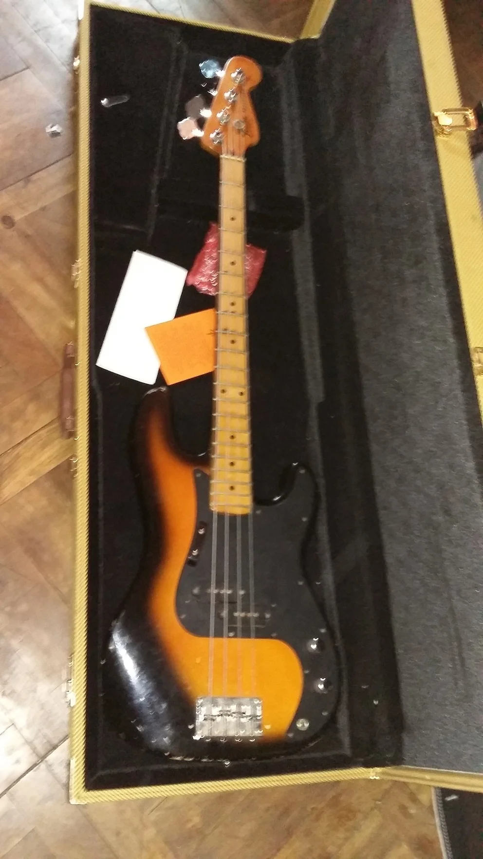 So liebe LEOs, da will mich jemand glaube ich verarschen. Da habe ich mir einen Fender Precision 1977 in sunburst zugetan, wohlwissend, dass Pickups und Bridge nicht original sind. Ich habe nämlich noch PUs von einem 77er Preci und dachte das wäre eine gute Sache als 2. Bass, der Preis war entsprechend ok. Nun wurde der mir geschickt und gemäss Seriennummer eh aus 1976. Im Koffer waren Dokumente von "damals", die schon etwas zu neu aussahen und vor allem war der fantastisch leicht. Komisch? Wäre ja gut und spielen lässt er sich auch gut, nur irgendwie das sunburst war auch ganz anders als bei meinem 77er und der Body irgendwie suspekt. Also aufgeschraubt und fotografiert und nicht schlüssig geworden, ausser dass die PUs kaum original sind, solche hatte ich noch nie an einem Fender gesehen. Bridge weggenommen und da sind nur 4 Bohrlöcher, da müssten doch 5 sein, oder?