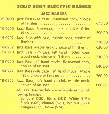Auf Anregung des Kollegen @FatFinger habe ich auch mal den Fender-Consumer-Service in den USA angeschrieben, um etwas über die Herkunft meines alten Jazzys zu erfahren ... leider reicht ihre Data-Base nur bis 1993 zurück ... es gab aber ein paar nette Mails hin und her ... mit Hilfe einer Preisliste von 1978 (siehe unten) ließ sich jedoch verifizieren, dass mein Bass damals tatsächlich in der Farbe "wine transparent" angeboten wurde ...