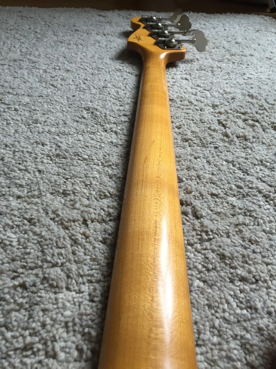 ich könnte mir aber vorstellen, dass ein Vorbesitzer den Lack vom Body runtergeschliffen hat und ihn blau gebeizt, geölt und gewachst hat.