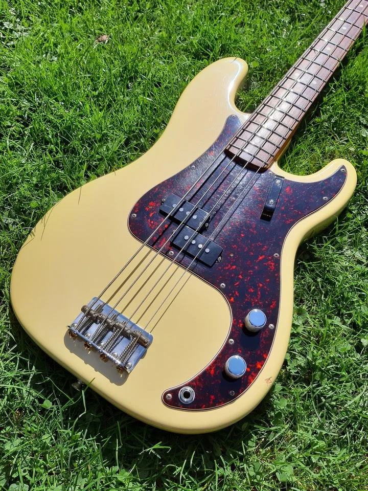 Aber auch kein Drama; der Bass ist definitiv gut! Die Saiten klingen ganz normal gleichmäßig, kein Absaufen, keine "Löcher" in den Lagen, der quasi obligatorische Deadspot auf der G Saite nur wirklich sehr zahm vorhanden. Findet soften als auch härteren Anschlag gut. Der Hals ist schon eine Ansage, aber könnte ich mich dran gewöhnen. Sieht bestimmt mit einem Mint Pickguard richtig cool aus.