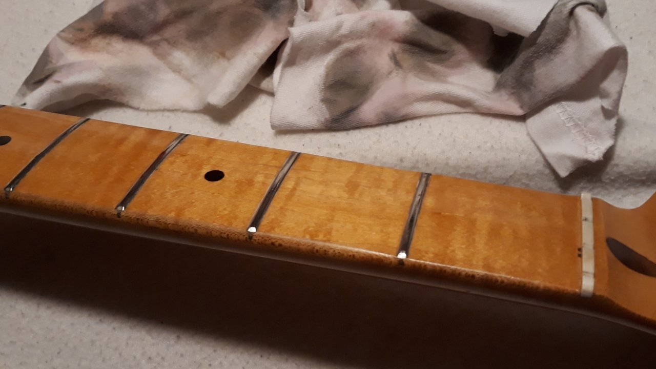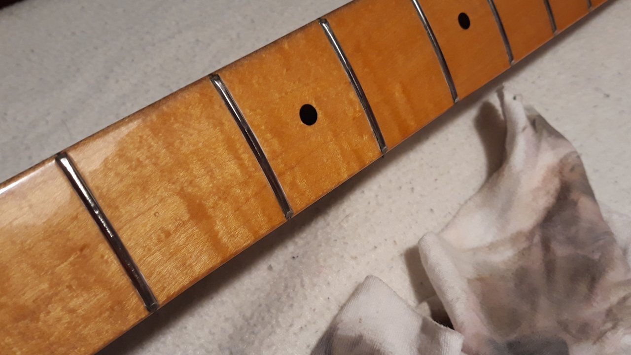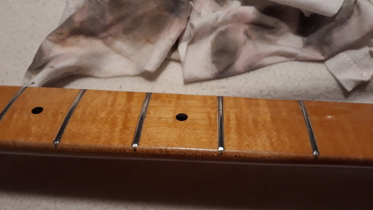 Das Griffbrett ist sehr sauber geworden und man sieht die Flammung des Ahorn Halses.