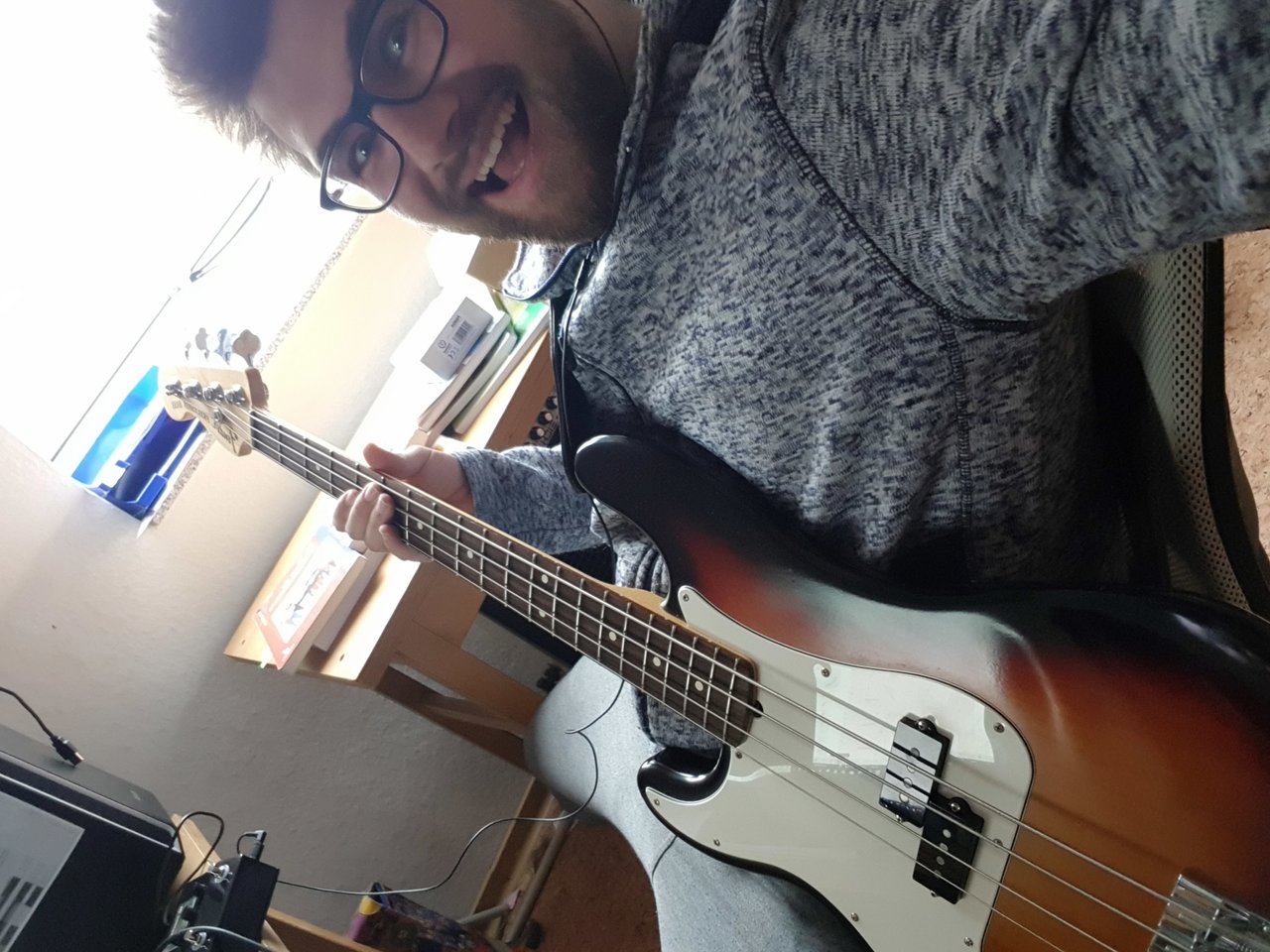 Saiten sind abgenudelte Rounds vom Vorbesitzer. Neue Dunlop Flats (55€..) liegen extra für ihn hier, aber ich finde den Sound gerade so geil, dass ich mich nicht traue zu wechseln...