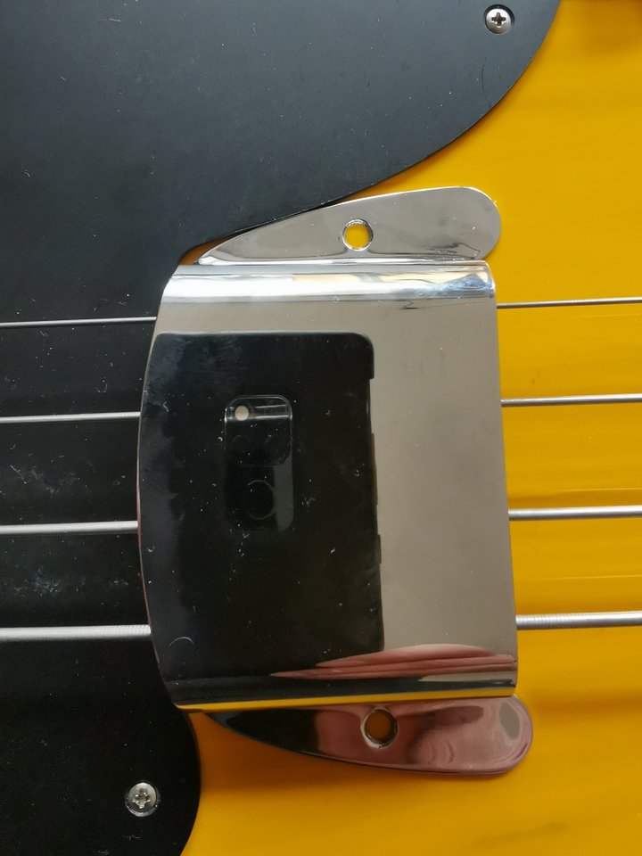 Jetzt ist es zwar weiter reingerückt, aber dadurch nicht mehr ganz symmetrische Saitenabstände. Die G-Saite ist näher am Blech als die E-Saite.Anhang anzeigen 373192