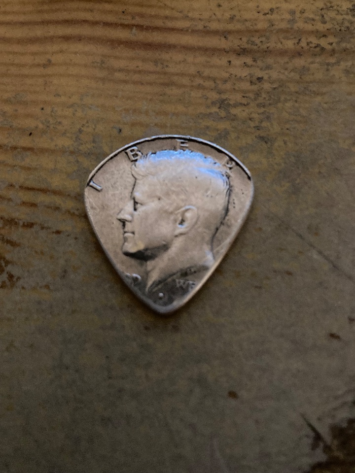 Ursprung ist eine Half Dollar Münze. Für mich ist das nichts, aber ein guter Freund (Gitarrist) liebt (handgemachte) Picks aus Münzen. Das letzte, was ich ihm vor zig Jahren mal aus ner Münze gefeilt habe, hat er irgendwann dieses Jahr verloren. Da ich noch ne passende Münze rumfliegen hatte, hab ich schnell nochmal eines gebastelt. Kriegt er heute Abend als verspätetes Weihnachtsgeschenk.