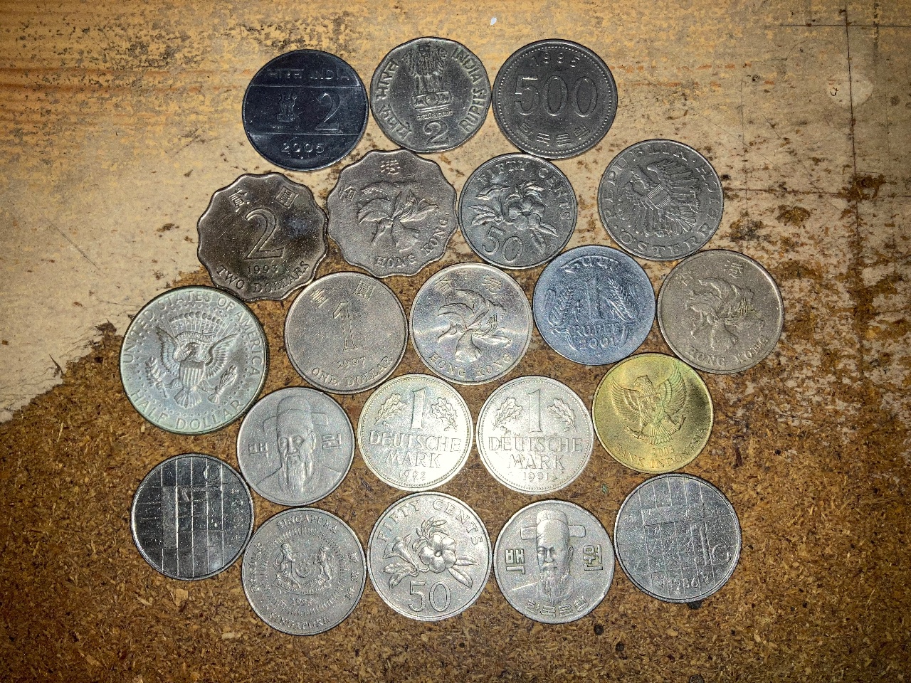 Kaum ist das Coin Pick verschenkt, kommen weitere Anfragen aus dem Bekanntenkreis. Also hab ich mal in meiner Münzen-Kiste gekramt und rausgesucht, was von der Größe her noch passen könnte. Deutsche Mark, Östereichische Schilling, niederländische Gulden, Hong Kong Dollar, US Dollar und noch ein paar Münzen aus Indonesien, Singapur, Taiwan und Indien. Auf dem Foto sind jetzt die Münzen, die noch nicht "vergeben" sind.