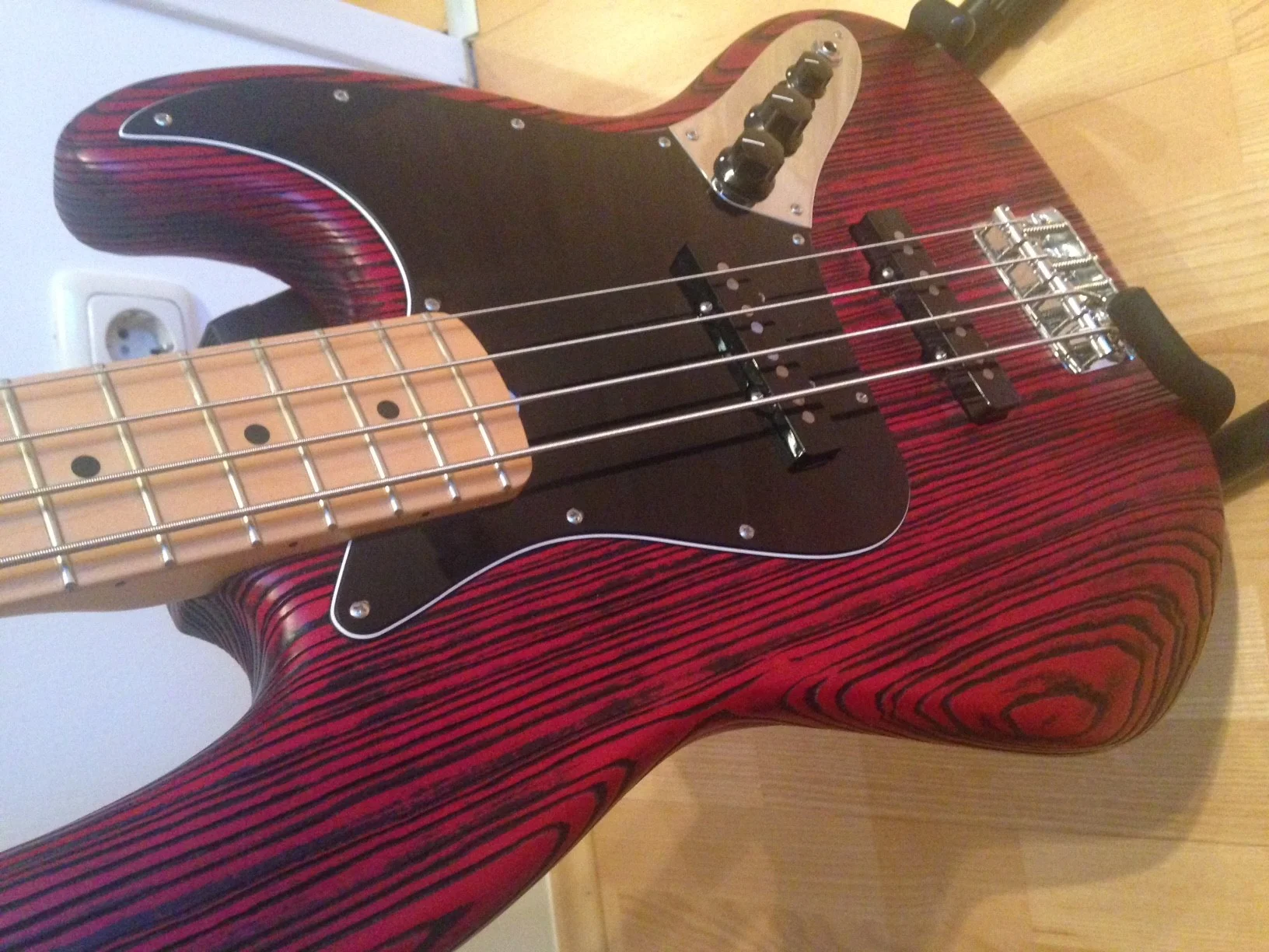 Er hat einen schwarzen US-Esche Body der sandgestrahlt und danach transparent rot lackiert wurde. Durch das Sandstrahlen wird die weichere Maserung ein wenig herausgelöst und so entsteht die wunderschöne Holzoberfläche. Durch diese Verarbeitung und das Eschenholz ist der Bass leichter und durch die sichtbare Maserung ist jeder Bass ein Unikat.