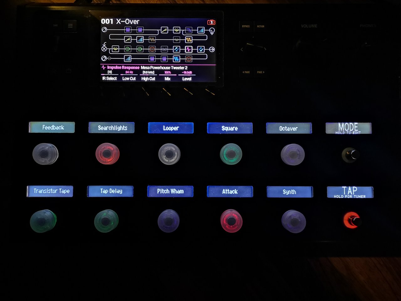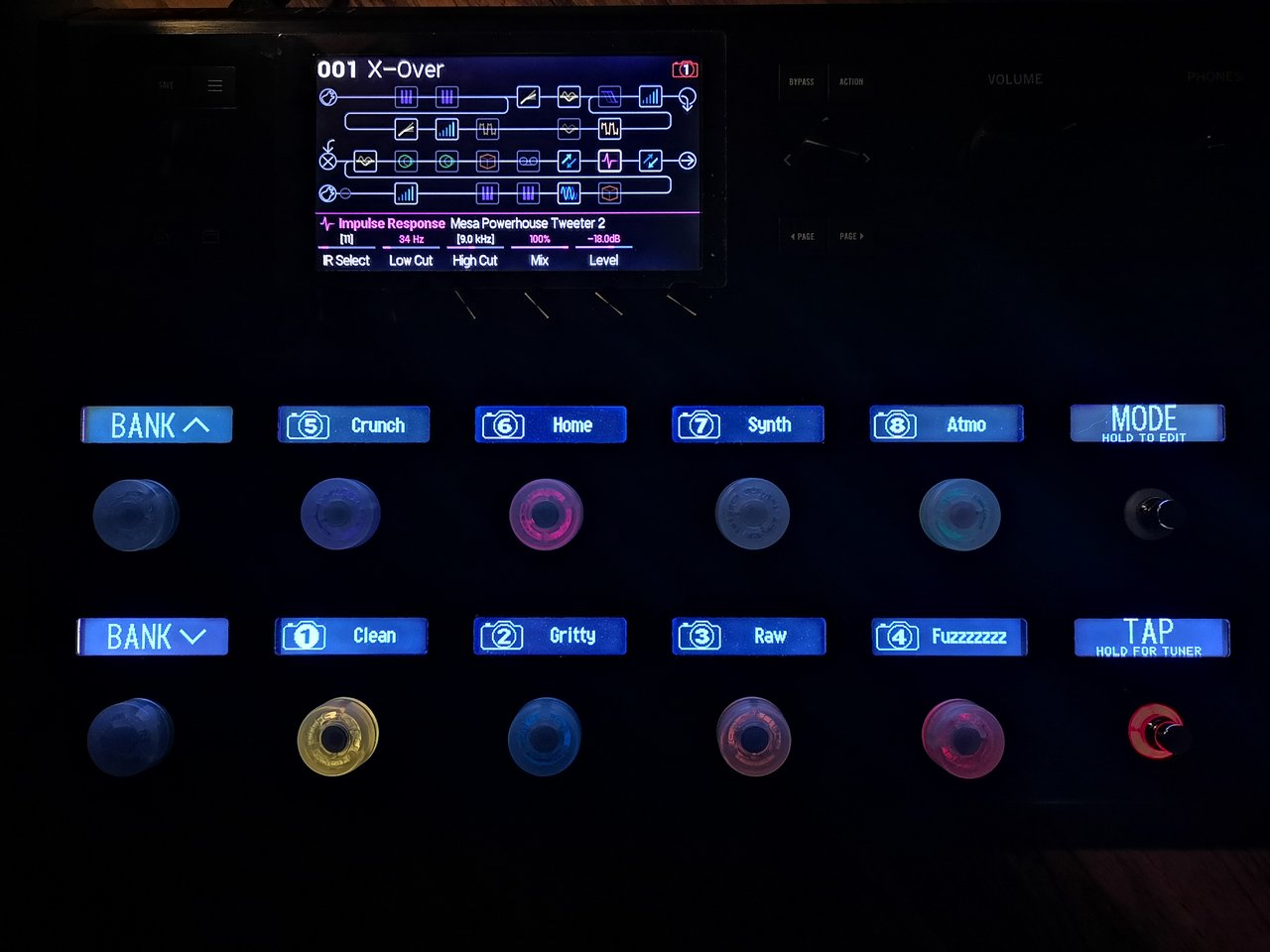 Das ist mein Hauptbildschirm, hier sieht man die Snapshots, benannt nach dem was sie tun. Verschiedene Abstufungen der Zerre, Home ist der Arbeitsname eines Songs, in dem ich mit Whammy hantiere, Synth und Atmo sollte selbsterklärend seindrücke ich oben rechts auf "Mode" kommt die Pedalboard Ansicht: Anhang anzeigen 223382