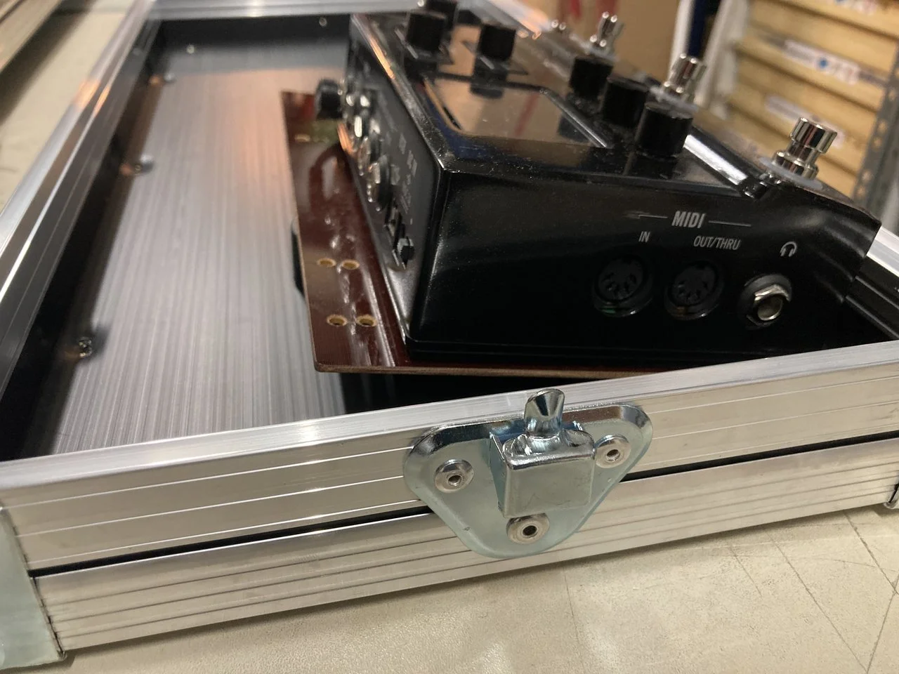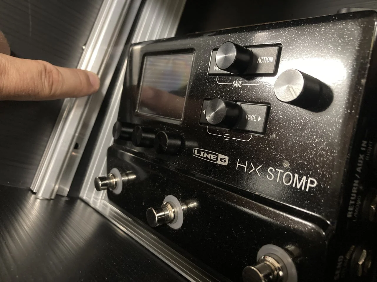 Die Höhe für den Zwischenboden großzügig bemessen, wir wollen ja keine eingedrückten Potis. Beim schon recht hohen HX Stomp reicht es, die Rackschienen umgedreht in die originalen Bohrlöcher zu nieten um eine Zwischenboden-Auflage in der richtigen Höhe zu erhalten.