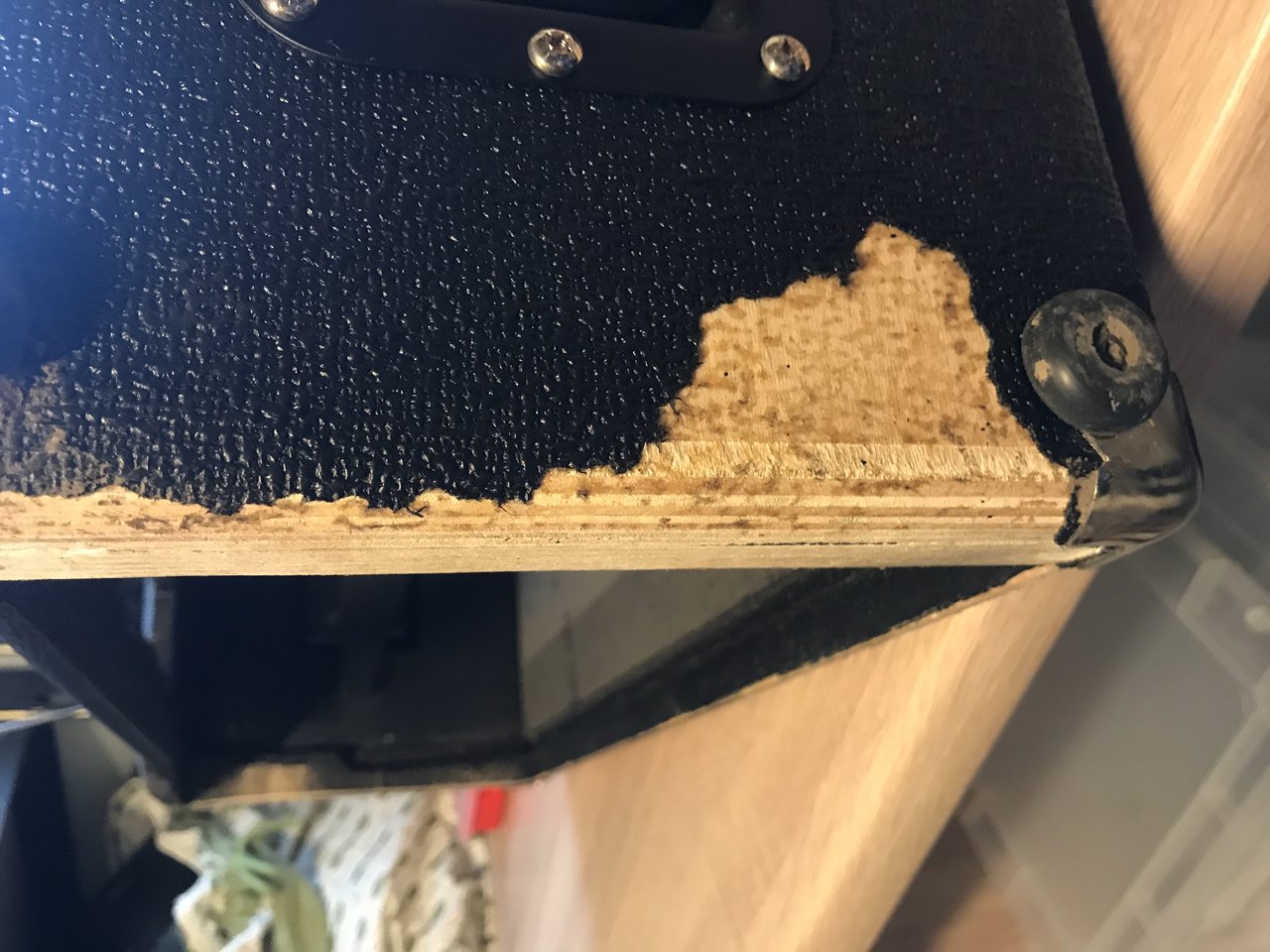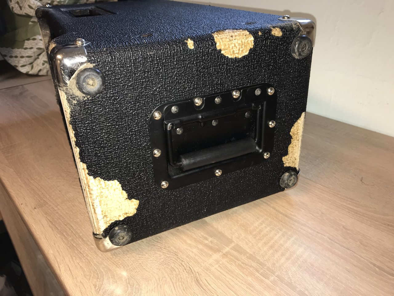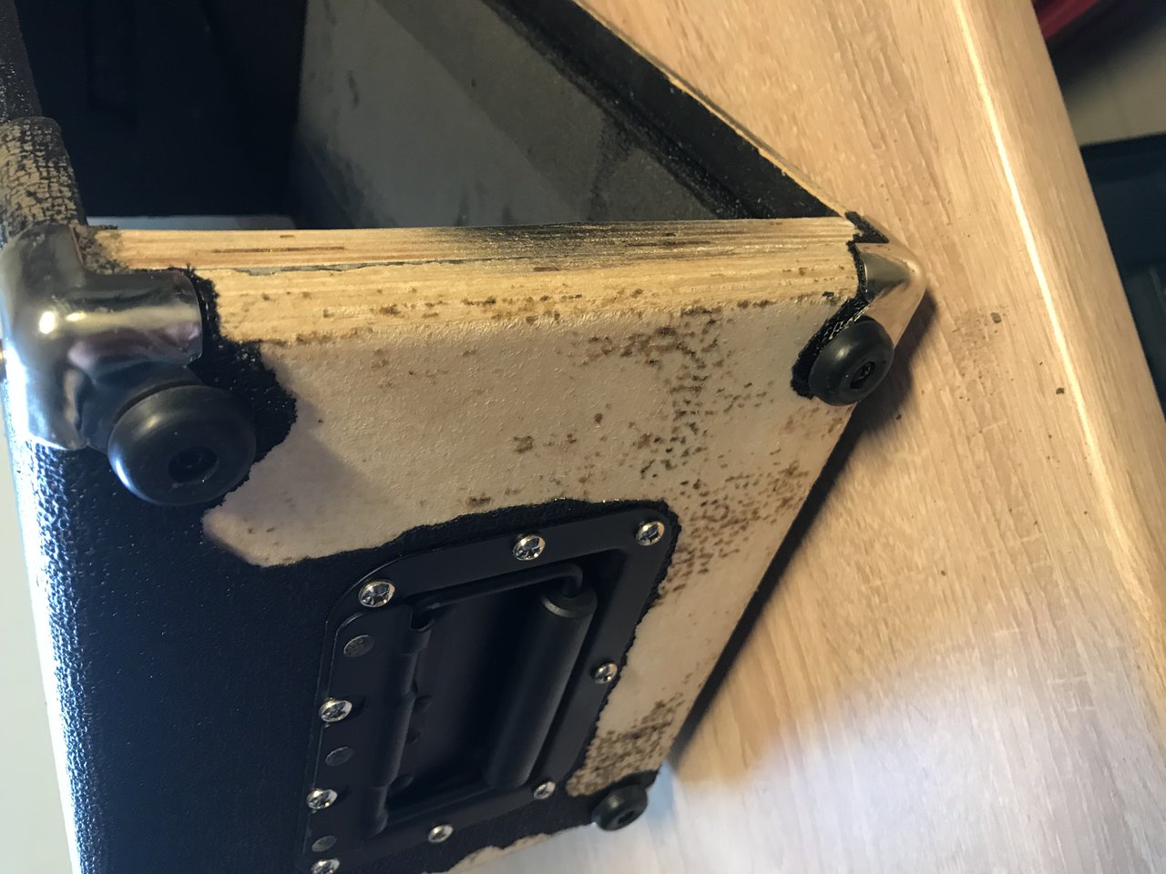 Jetzt muss ich die Reste des Bezugs und des Klebers irgendwie abkratzen. Und dann mich umschauen, wie ich wieder neues Tolex drauf bekomme.