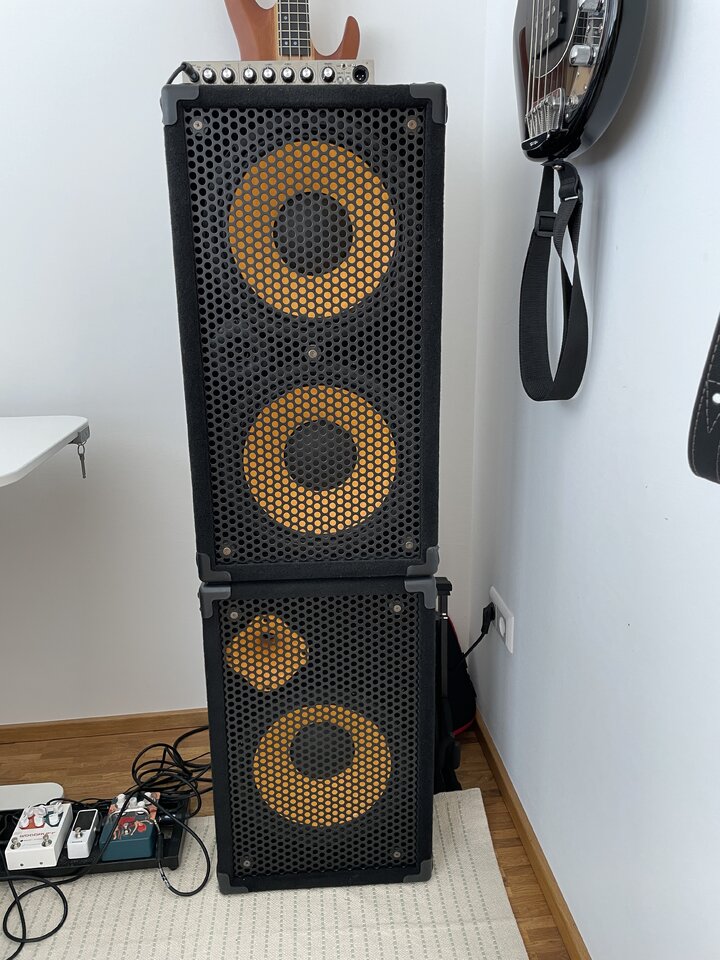 ....mächtiger Turm, passt optisch am besten. Die 121H fungiert hier klanglich mehr als Subwoofer, mildert trotzdem die Aggressivität der 122er deutlich. Dafür kommt alles sehr sauber. Die beiden besseren Hochtöner machen sich auch bemerkbar. Klingt knurrig, aber sauber. Wird sich angenehm durchsetzen in der Band.