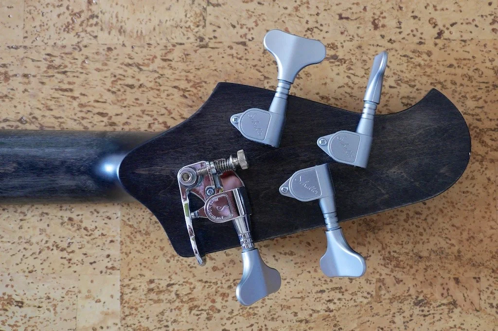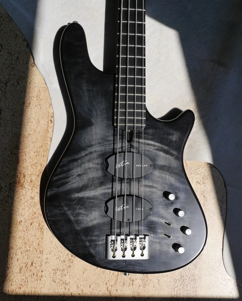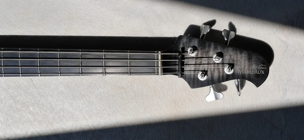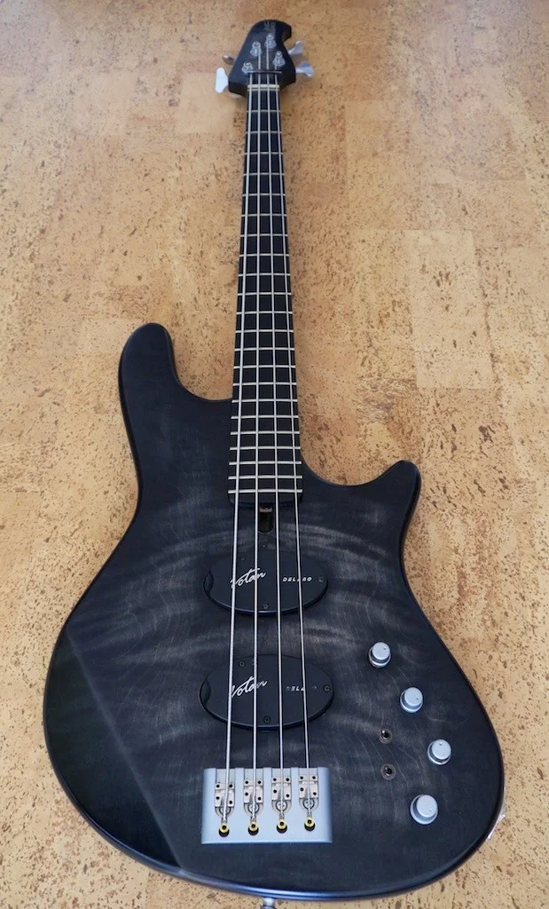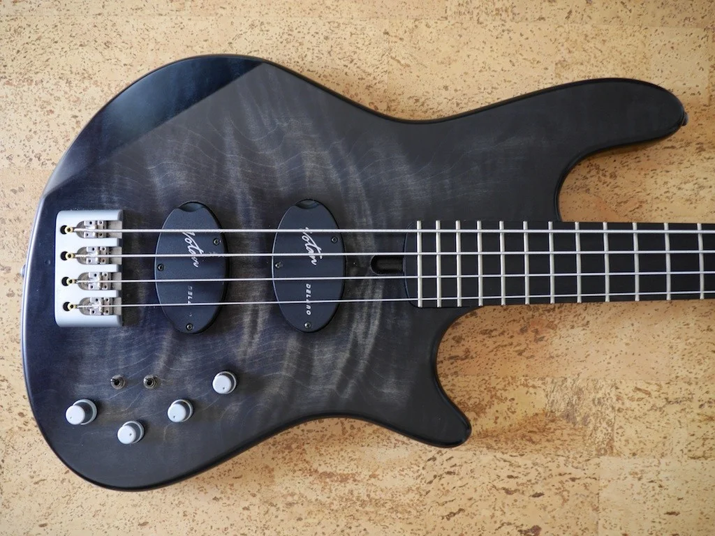 Marleaux Votan 4 Deluxe Blackburst, Dibetoukorpus, Satin blackburst geflammte Ahorndecke, Delano Quadcoil Pickups, Matching Headstock, D-Tuner, gebeizter vogelaugenahorn Hals, Ebenholzgriffbrett, HW: ETS, Schaller matt chrom, Gigbag, SNr: 147; Geburt: 10/2011; (incl. Dokumappe von Marleaux mit Zertifikat, Rechnung, Prospekte, 4 Aufkleber & Marleaux Polstertasche.