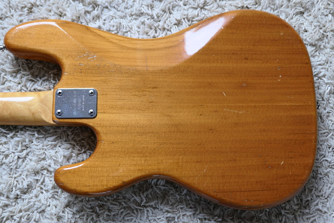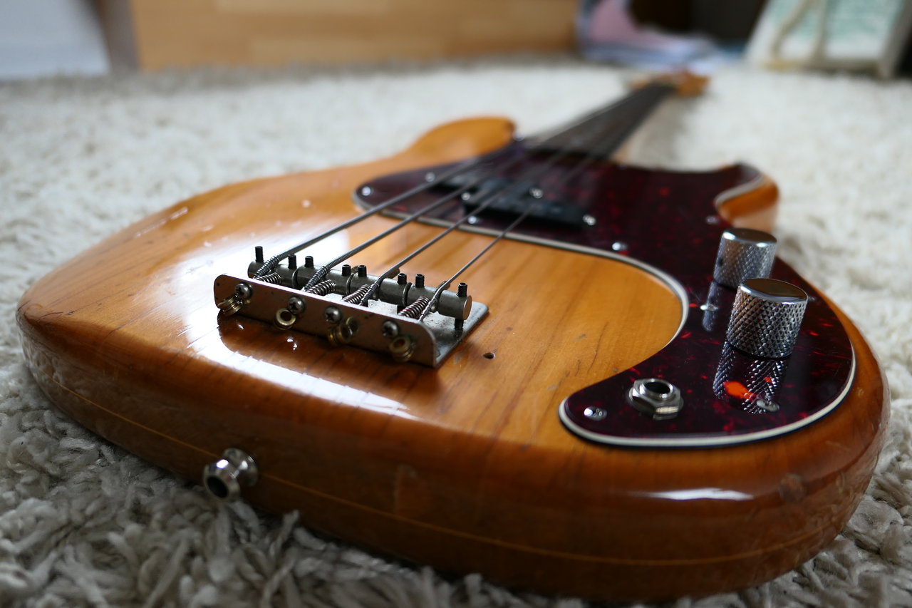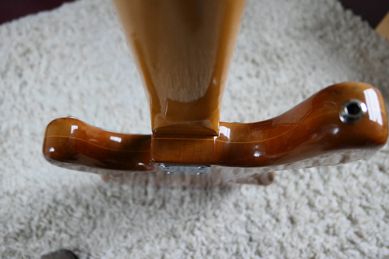 So, heute ist der Greco angekommen. Zustand: richtig vintage mit Macken, Lack teilweise leicht rissig, etwas Rost etc. Ich find's tatsächlich klasse. Mechaniken funktionieren, Halsspannstab dreht sich geschmeidig, Saitenlage ist sehr flach, Bünde wurden vor drei Jahren erneuert, Potis kratzen nicht, Output enorm, Sound von sehr mumpfig (Tonblende zu) bis schön mittig (Tonblende offen). Gewicht 3,94Kg. Sehr angenehm. Fühlt sich insgesamt sehr gut an. Der Korpus ist in Sandwich-Bauweise, allerdings aus mehreren Teilen, was man aber nur bei sehr genauem Hinsehen sieht (wurde wohl Mitte 70er Jahre sehr oft so gemacht). Macht nix, schönes Teil. Außer, dass keine