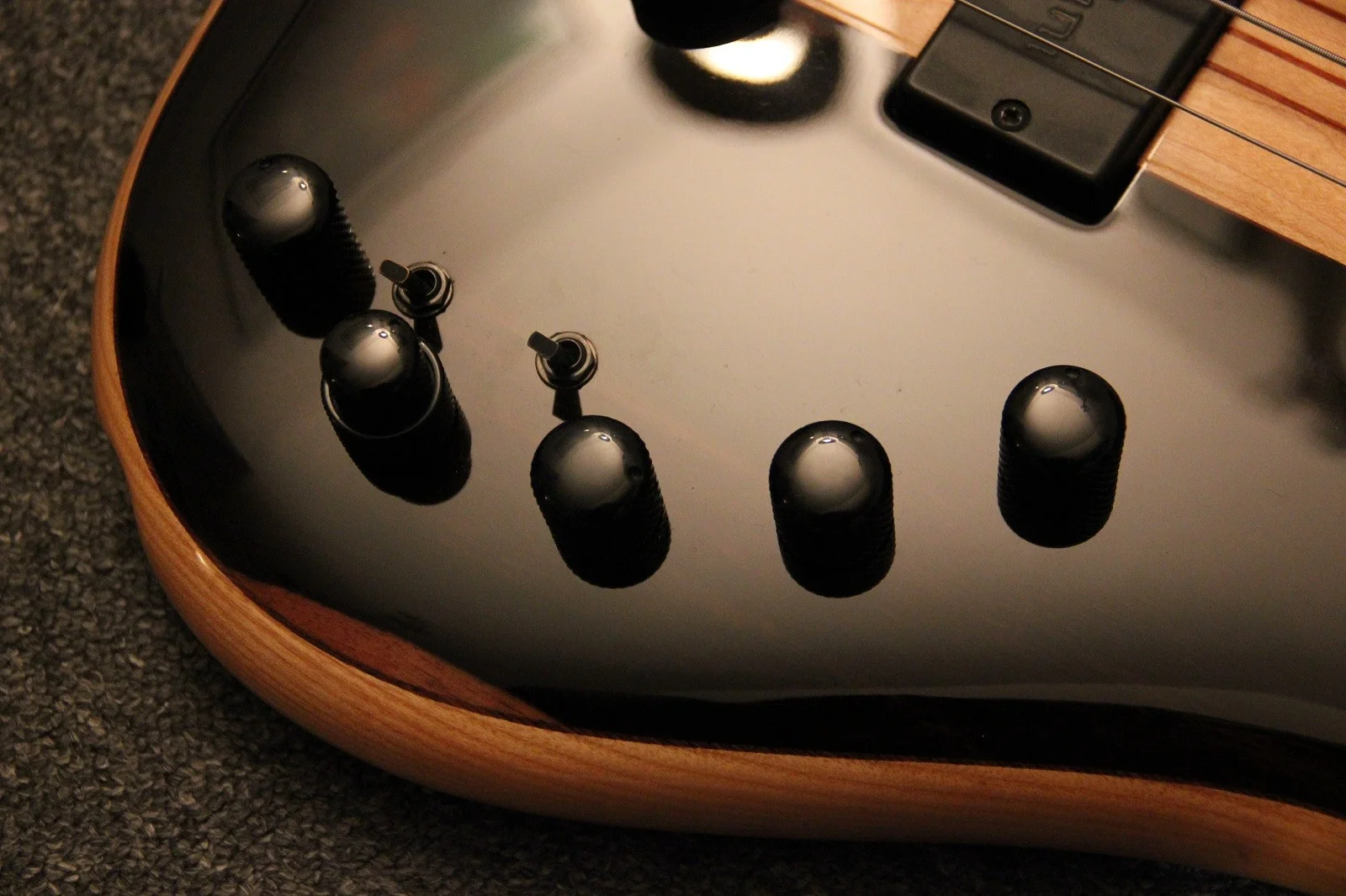 Regler: 1x Master Volume, 1 x Balance, 1x Bass, 1 x Mitten, 1 x Höhen, 1 x Schalter Aktiv/Passiv, 1 x Schalter LEDs an/aus