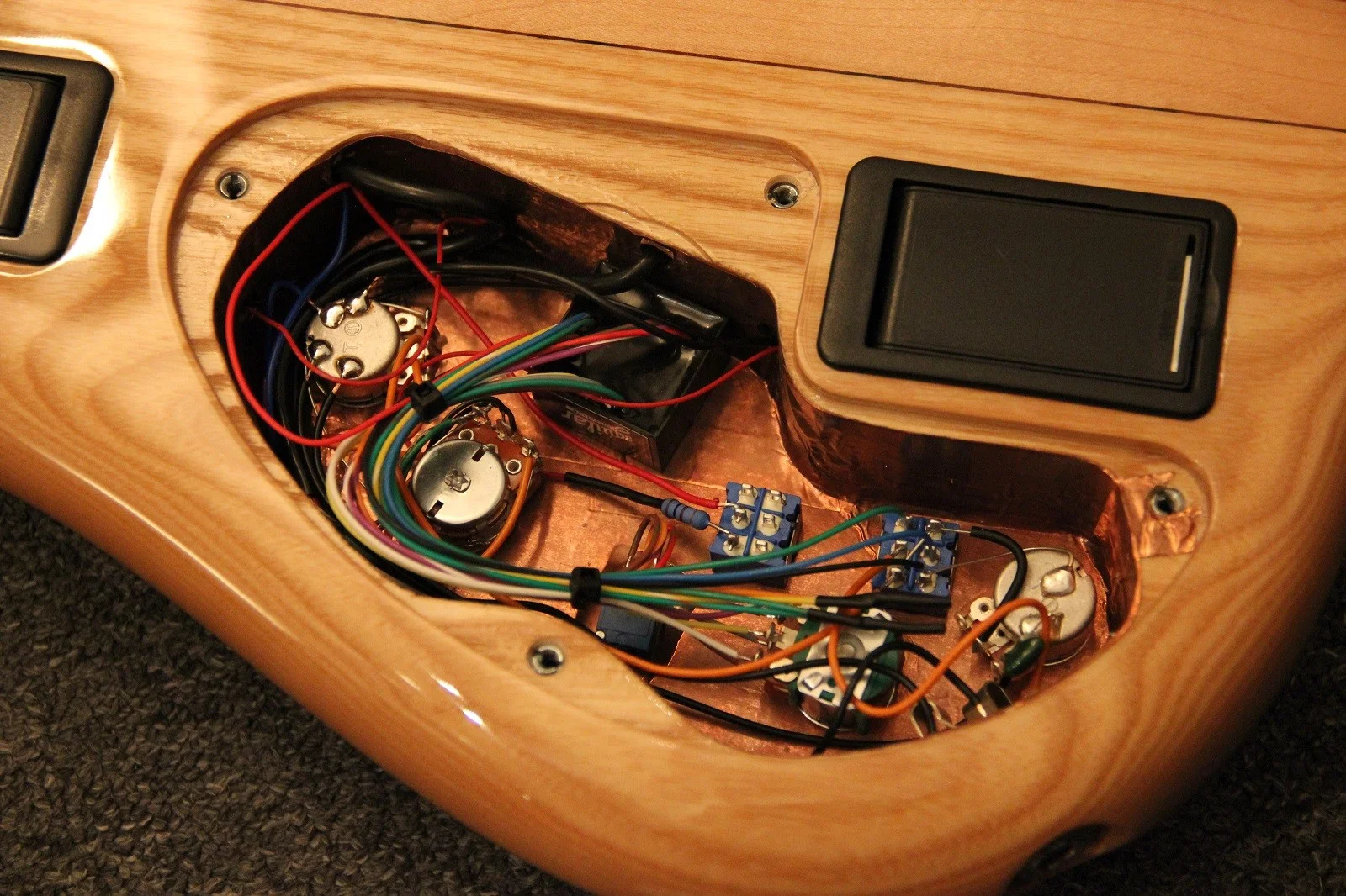 Der Deckel des E-Fachs besteht aus Esche. Perfekt wäre es, wenn der Deckel die gleiche Maserung hätte wie der Korpus. Sowas habe ich mal bei Alembic gesehen, aber das muss ziemlich aufwendig sein und Alembic ist natürlich noch um einiges teurer - wenigstens ist es keine Plastikkappe. Das Innere des Elektronikfachs ist aufgeräumt und der kleine „Aguilar-Würfel“ verbraucht deutlich weniger Platz, als die alte, aktive Elektronik meines Alembics. Die Kabel sind Robust und dürften lange halten. Die Schraubgewinde für den E-Fachdeckel sind aus Metall – das sind so Kleinigkeiten, die mir besonders gefallen.