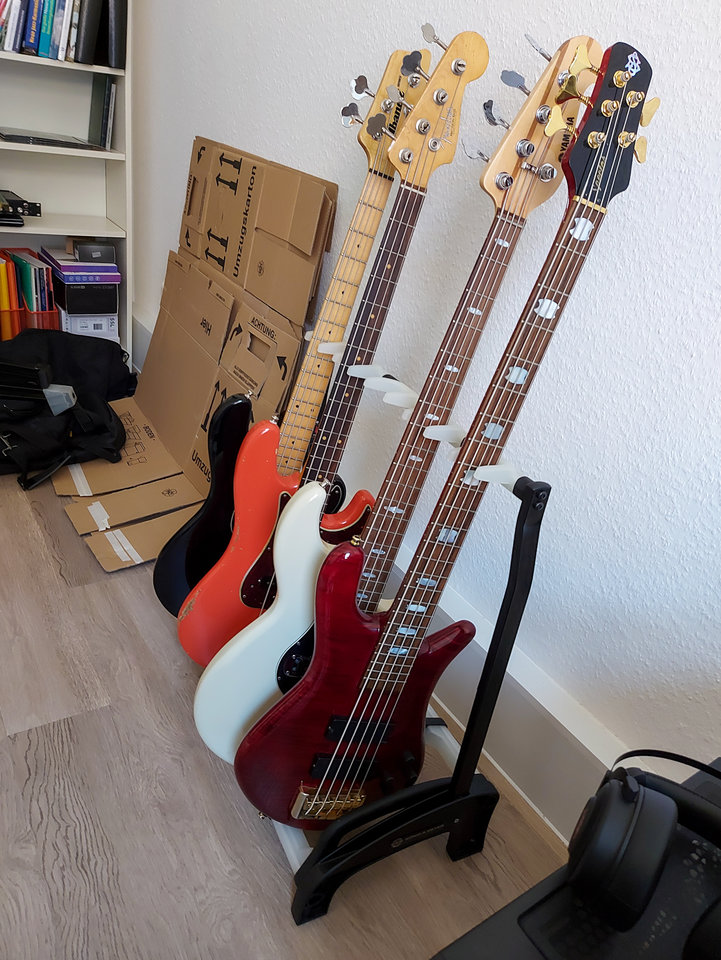 Der ist variabel, so dass akustische und elektrische Bässe frei kombiniert werden können. Allerdings nimmt er im Grundriss etwas mehr Platz ein, weil die Instrumente etwas schräger (und damit auch sicherer) drinstehen als bei einigen anderen Ständern. Nicht so gut gefällt mir, dass die verschiebbaren Halter aus Plastik sind aber das bedingt wohl das Design.