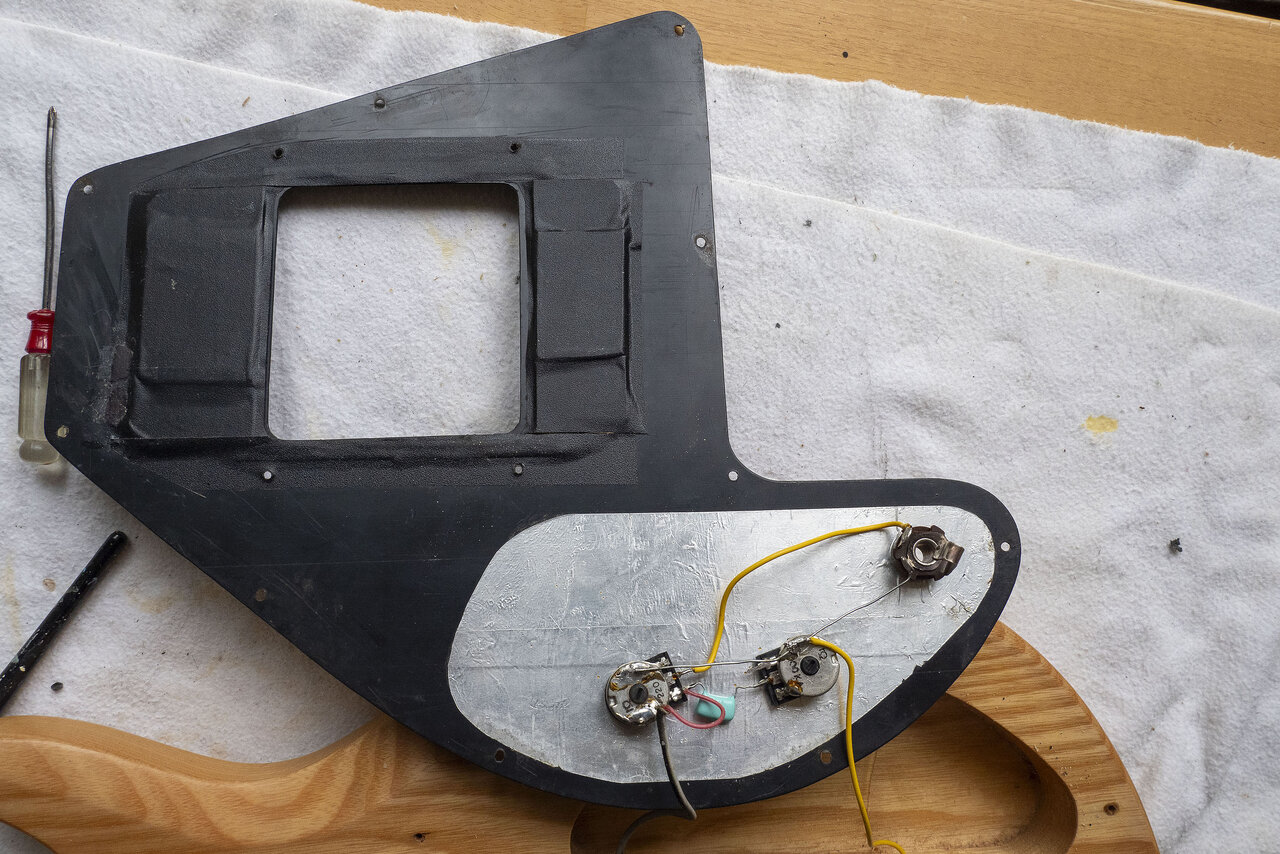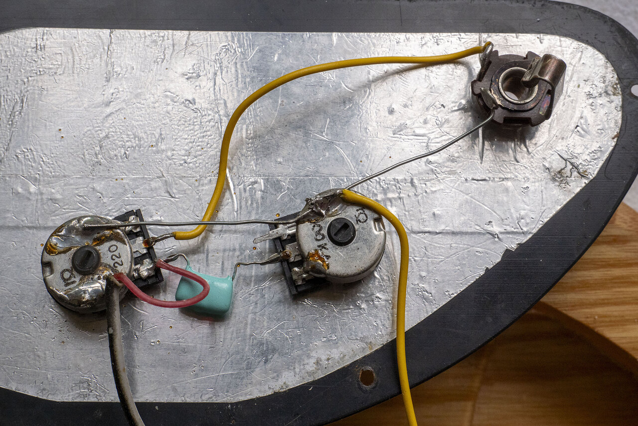 erstaunlicherweise war die elektronik und das pickup trotz der feuchtigkeit noch voll funktionsfähig. Die poties kratzten jedoch stark. Als ich diese mit kontaktreiniger gespült habe, mutierte das volumenpoti jedoch zum ein-aus-schalter, also musste ich es leider ersetzen.