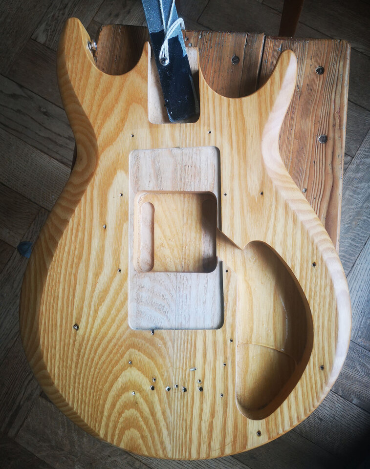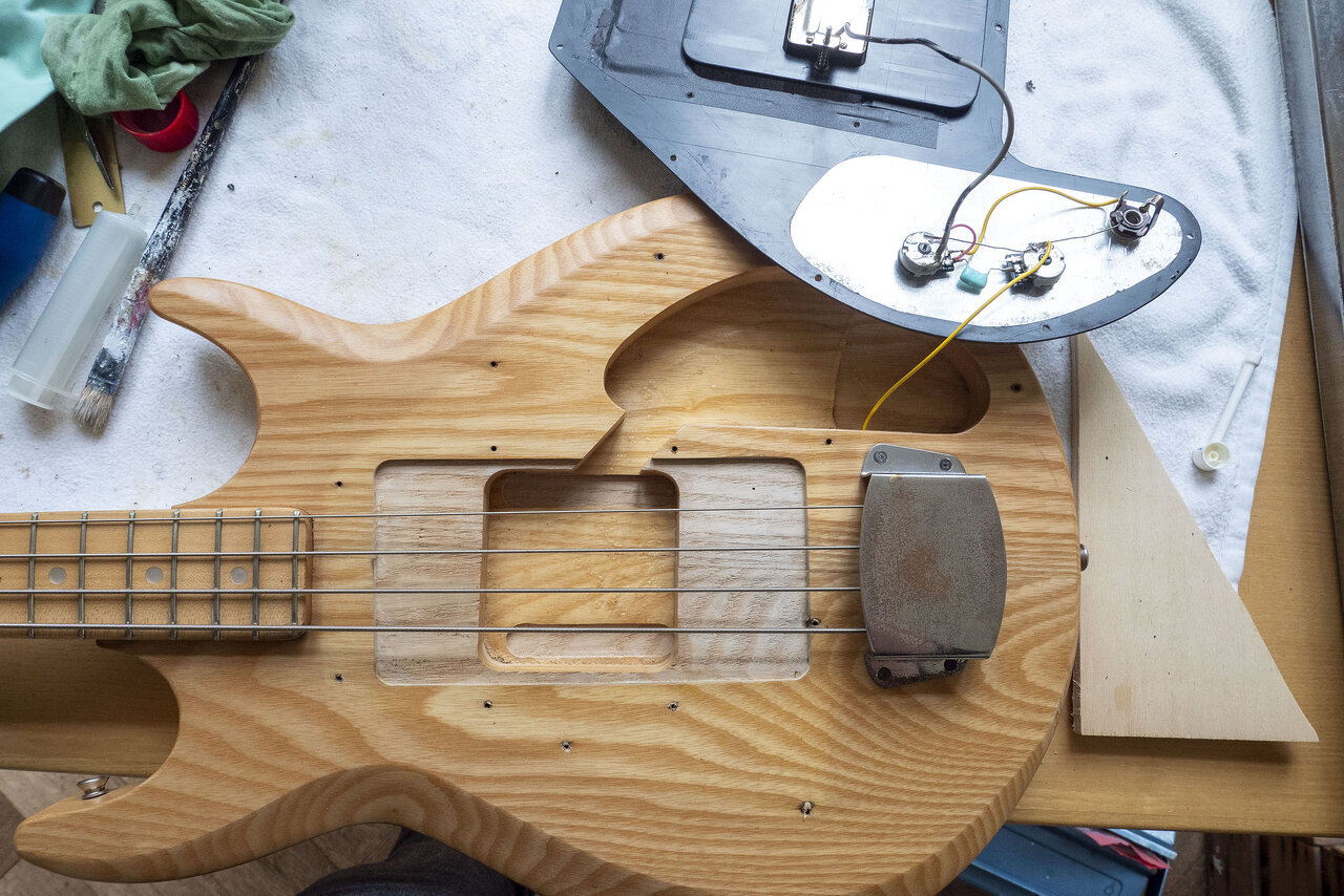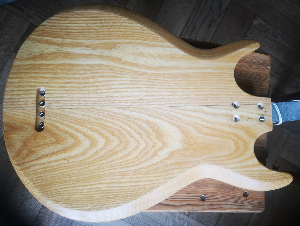 der bass war in sehr schlechtem zustand, offenbar war der bass lange in einer warmen und wohl teilweise feuchten umgebung gelagert, weshalb der leim sich augeweicht hatte und der korpus auch eine leichte schwindung erlitt. das liess sich jedoch richten. die leimfuge des zweiteiligen korpus war sehr spröde und ist aufgebrochen, als ich ein bisschen dran gewackelt habe. also musste zuerst der alte leim abgekratzt und dann der korpus mit titebond neu verleimt werden. ich musste anschliessend den lack an der leimfuge abschleifen. darauf habe habe ich eine schicht hartöl aufgetragen. Der korpus sieht nun gut aus. die reparatur ist nur erkennbar, wenn man davon kenntnis hat. die fuge ist leicht angedunkelt, jedoch komplett geschlossen. auch die leimfuge im zweiteiligen hals hatte einen spalt und musste gereinigt und neu geleimt werden.