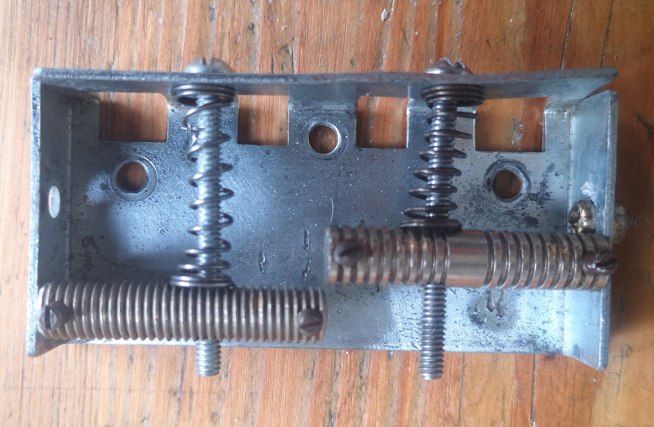 jetzt zur brücke: als einziger unterschied zum original ist sie von ziemlich minderwertiger qualität. sie besteht aus einem gebogenen blech und hat nur zwei saitenreiter. das heisst, die intonation kann nur rudimentär eingestellt werden. zusätzlich war sie stark korrodiert. ich habe sie trotzdem gereinigt und wieder zum funktionieren gebracht. auch wenn mir bewusst ist, dass originalität bei vintageinstrumenten durchaus wichtig ist, habe ich mich entschieden, die brücke zu ersetzen. Ich habe dafür einen fender-style blechwinkel gewählt, der noch bei mir rumlag. jedoch wollte ich die ursprüngliche string-through-body besaitung erhalten. Deshalb habe ich den blechwinkel durchbohrt – unter einhaltung der bereits vorhandenen saitendurchführungen. Leider stimmte der abstand nicht genau, aber ich denke, die funktionalität ist gewährt.