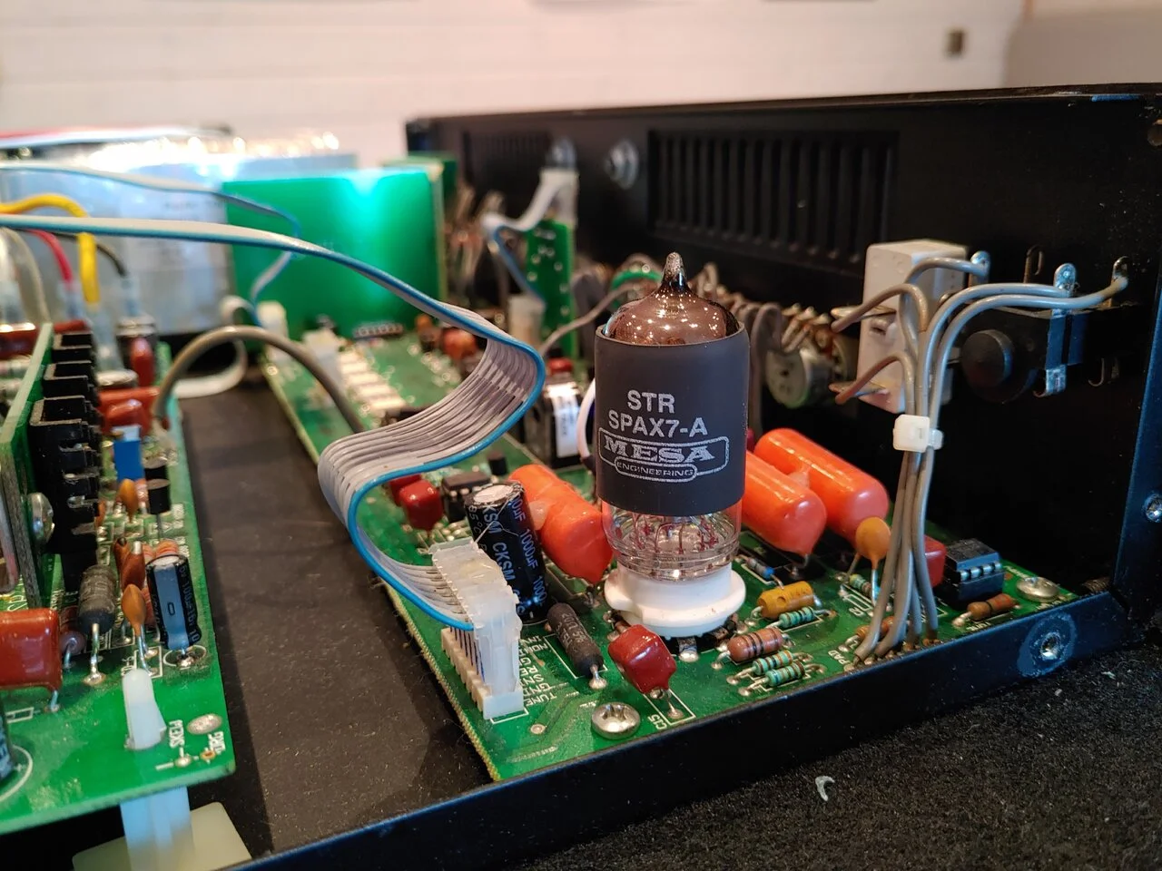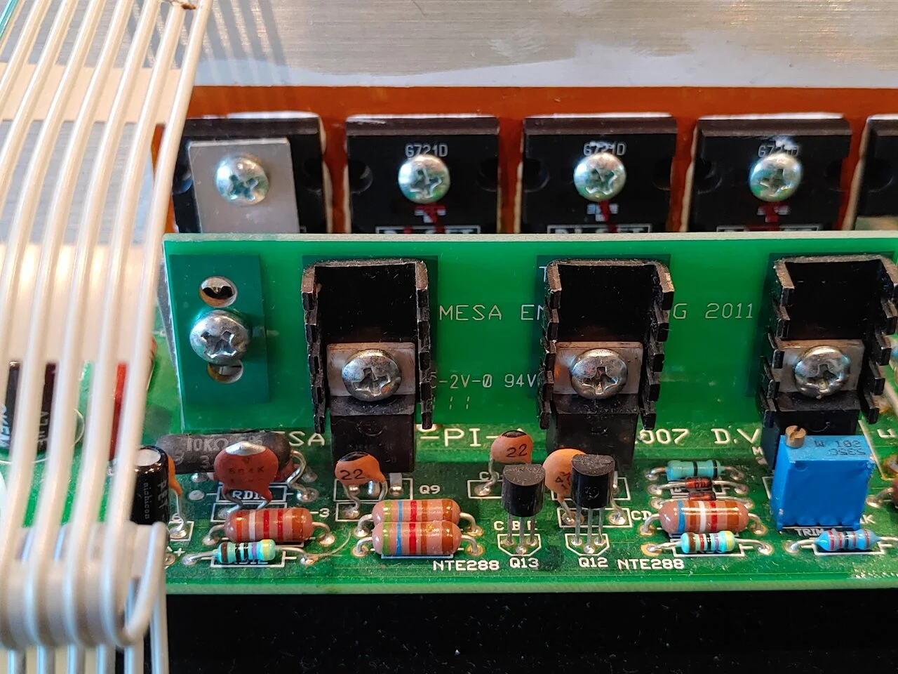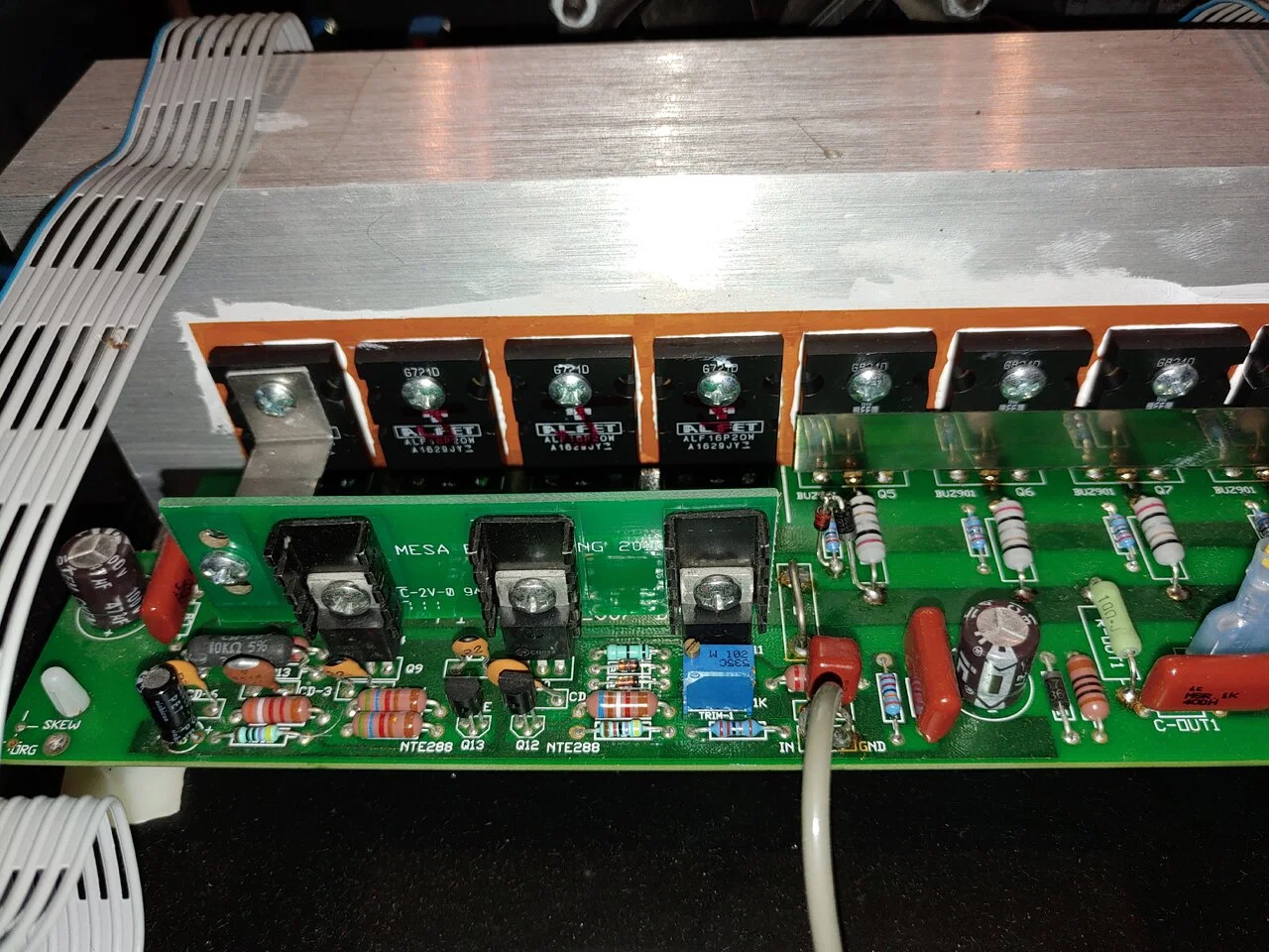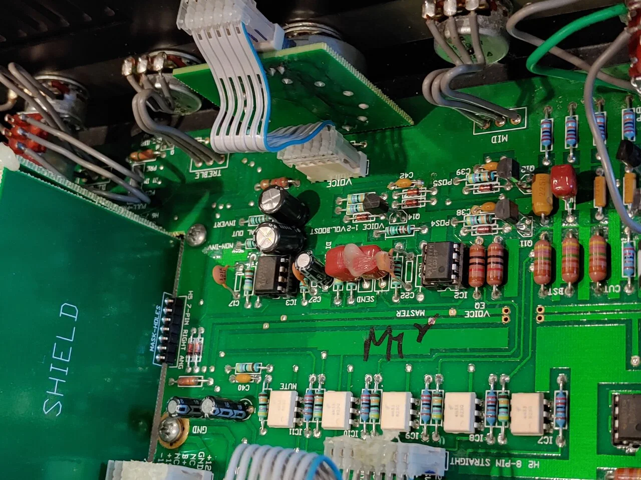 Ich denke man kann ganz gut erkennen was die Techniker bei Mesa da geändert haben: ein paar Bauteile wurden fliegend montiert, die Transistoren sind andere wie auf der Platine vermerkt und im Schaltplan stehend usw.