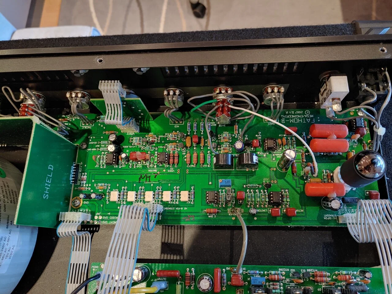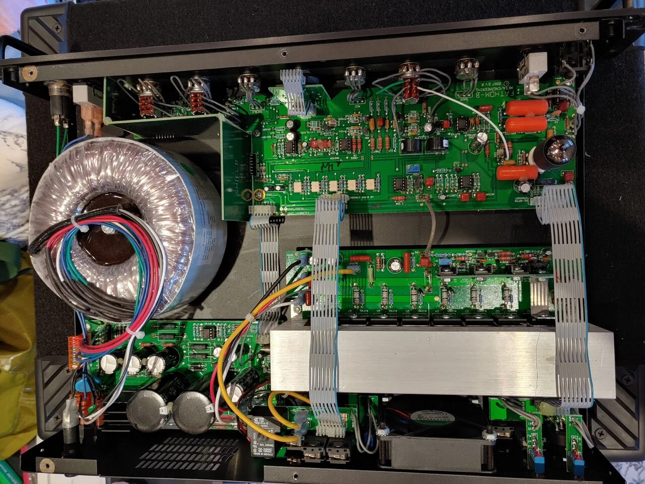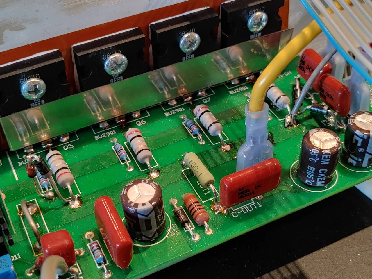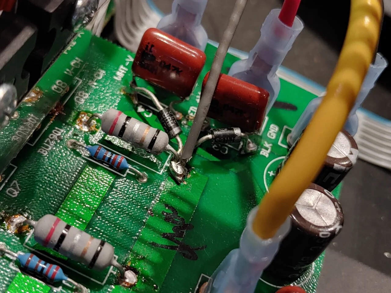 Ich denke man kann ganz gut erkennen was die Techniker bei Mesa da geändert haben: ein paar Bauteile wurden fliegend montiert, die Transistoren sind andere wie auf der Platine vermerkt und im Schaltplan stehend usw.