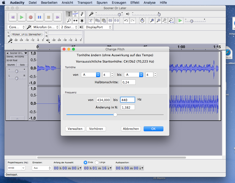 Zum mitspielen müsste man also immer das Instrument (Gitarre od. Bass) verstellen. Tut dem Instr. nicht so gut. Darum die Frage: Gibt es eine Software, wo ich die mp3 Datei auf 440Hz, heute gebräuchlich, hinauf oder hinuntertunen, abspeichern und auf dem Handy so dann anhören kann.