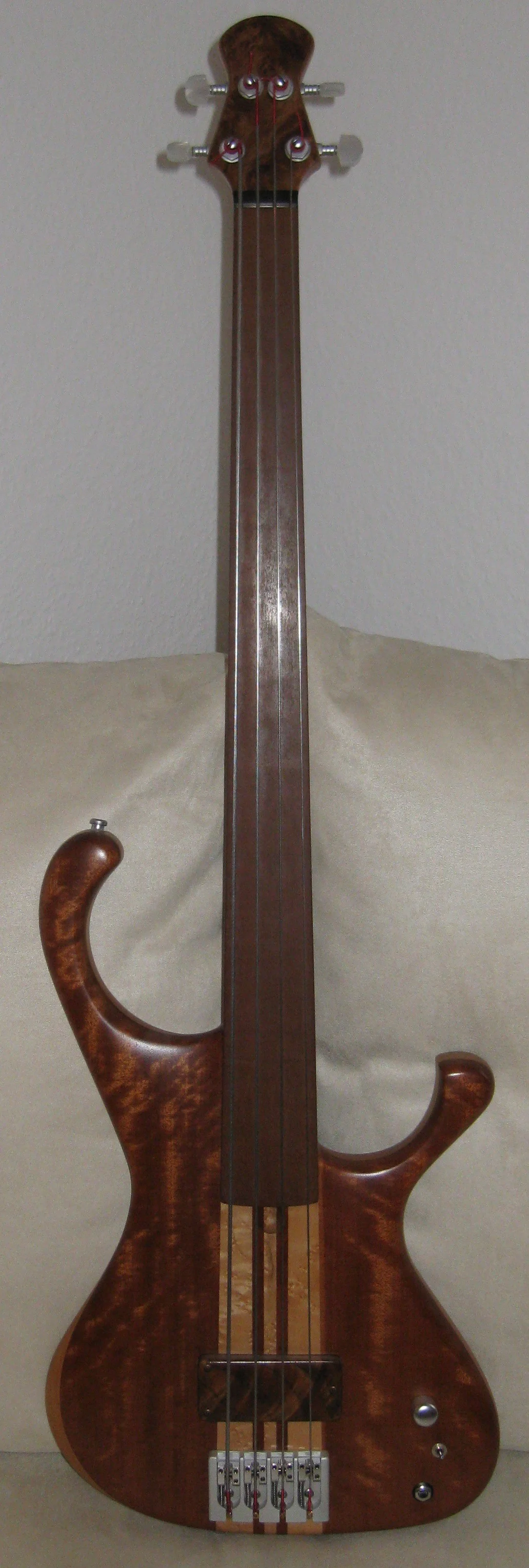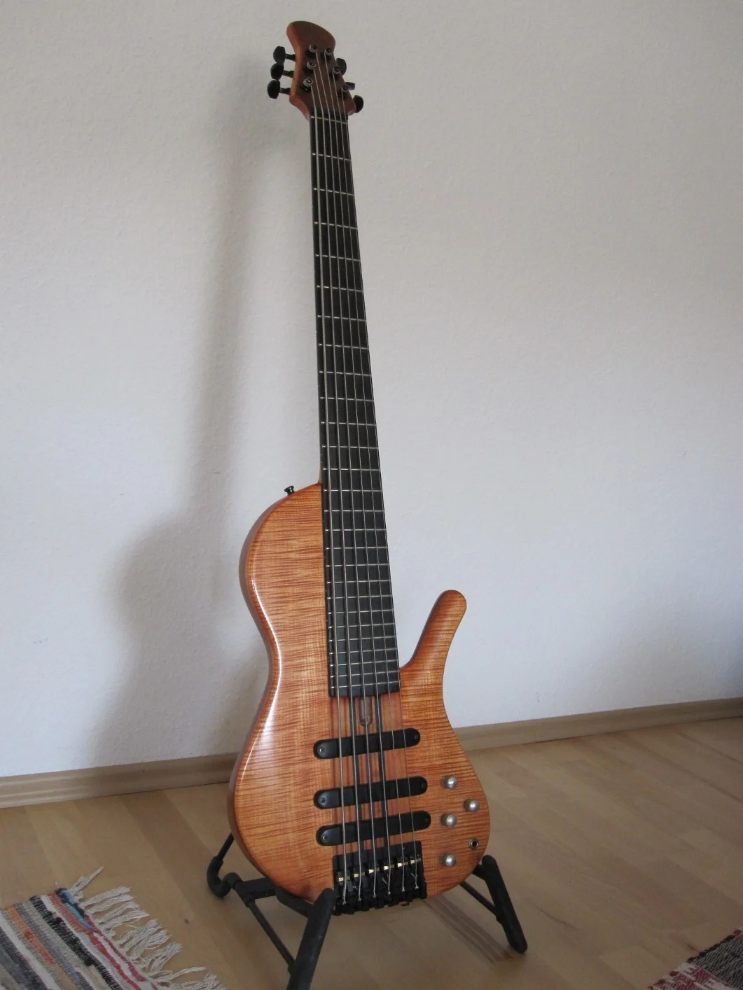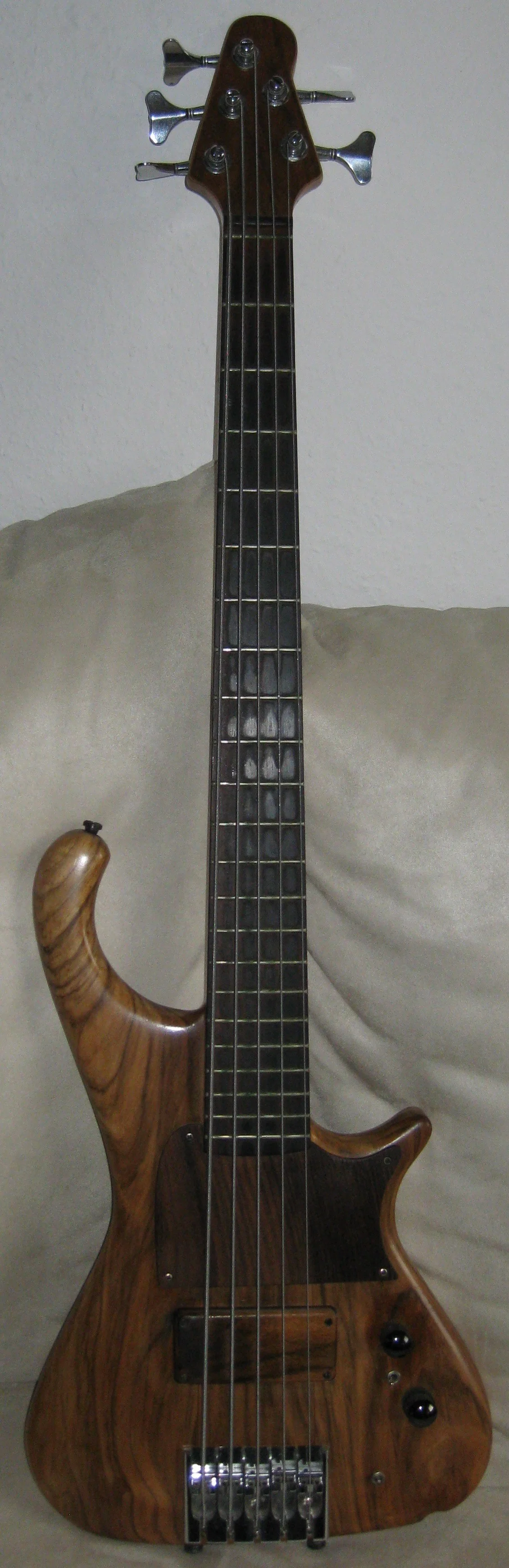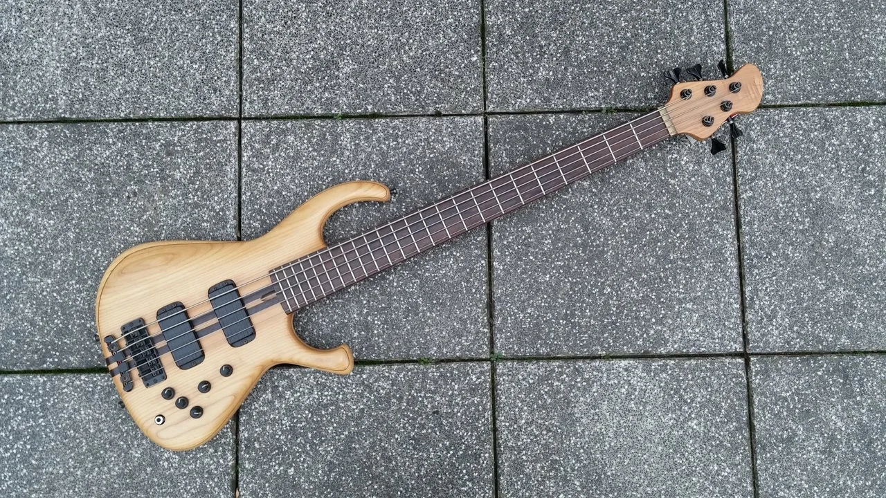 Ein für mich eigentlich völlig untypischer Bass, mit durchgängigem gesperrten Hals, Eschedecke auf Erle-Flügel mit Nussbaum gesperrt, edle Hardware, Kurandt 2Band, passiv schaltbar, zwei dicke Humbucker von Christof, wovon der vordere als Splitcoil splitbar ist. Ein ziemlich cooler Hobel das Teil! Die Übergabe war eine win/win Sache, da der Tauscher den Jazzy total klasse findet für seinen Rock und Blues und ich habe jetzt ein schönes Fummelbrett - doch halt: ja, man kann tierisch auf dem Ding abgehen, aber er ist kein "only filigran-Kram" Bass. Der Hals ist schön dick im satten D-Profil und das Griffbrett vom Radius auch nicht ganz plan wie bei vielen Fummelbrettern. Der Hals fühlt sich also eher erdig und griffig an. Einen guten knackigen 5 Saiter wollte ich schon lange haben und vor allem ist die B-Saite völlig homogen im Gesamtsound eingebunden, die höheren Saiten fallen nicht dünn ab.