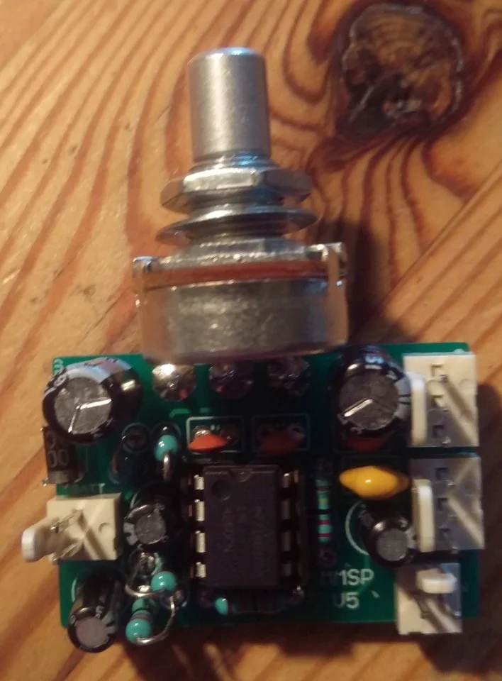 Anschliessend den IC Sockel( auch so ein Ding - direkt eingelötet gibt es nachher weniger Platzprobleme, aber das musst Du selbst entscheiden), die stehenden Widerstände und die Elkos(Polarität beachten!) einsetzen. Zuletzt die Molexverbinder und das Poti einlöten und der Bausatz ist soweit verdrahtungsbereit. Die Kabel für Potis und Buchse würde ich erst verlöten, nachdem alles auf der Banane verschraubt ist, sieht einfach besser aus und man kann vorher prüfen, ob das Alles so auch in den Bass paßt.