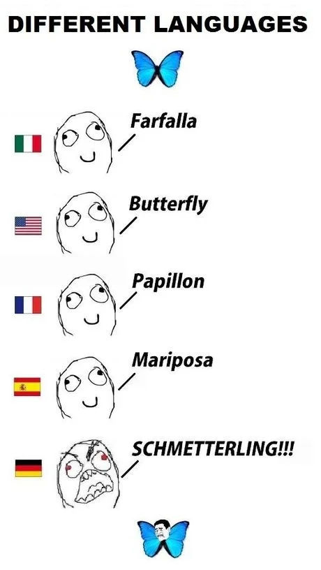 Aber ganz ehrlich: Wenn man nicht den Sprachfehler von dem Rammstein-Sänger hat, klingt "Schmetteling" zumindest auf Hessisch nicht härter als "Butterfly".