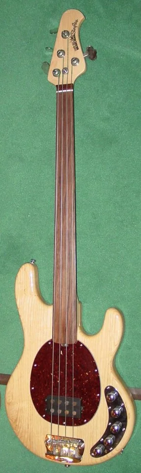 Der andere Stingray (mein Hauptbass) ist vintage Sunburst mit schwarzem Pickguard und Palisander Griffbrett.