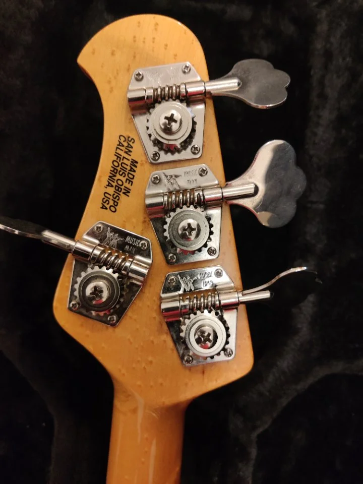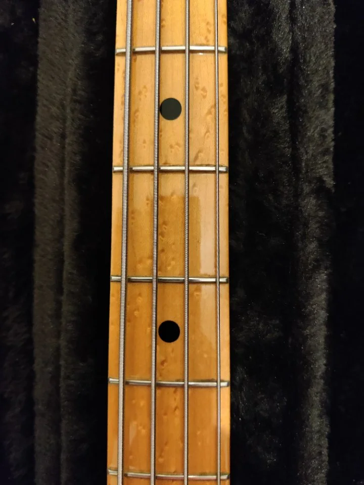 String Through Saitenführung und eine klassische Brücke mit Mutes. Dazu kein Gunstock Oil sondern lackierter Hals in richtig schöner Birdseye Maple Ausführung. Dazu klassisches Logo am Headstock angelehnt an das Originale.