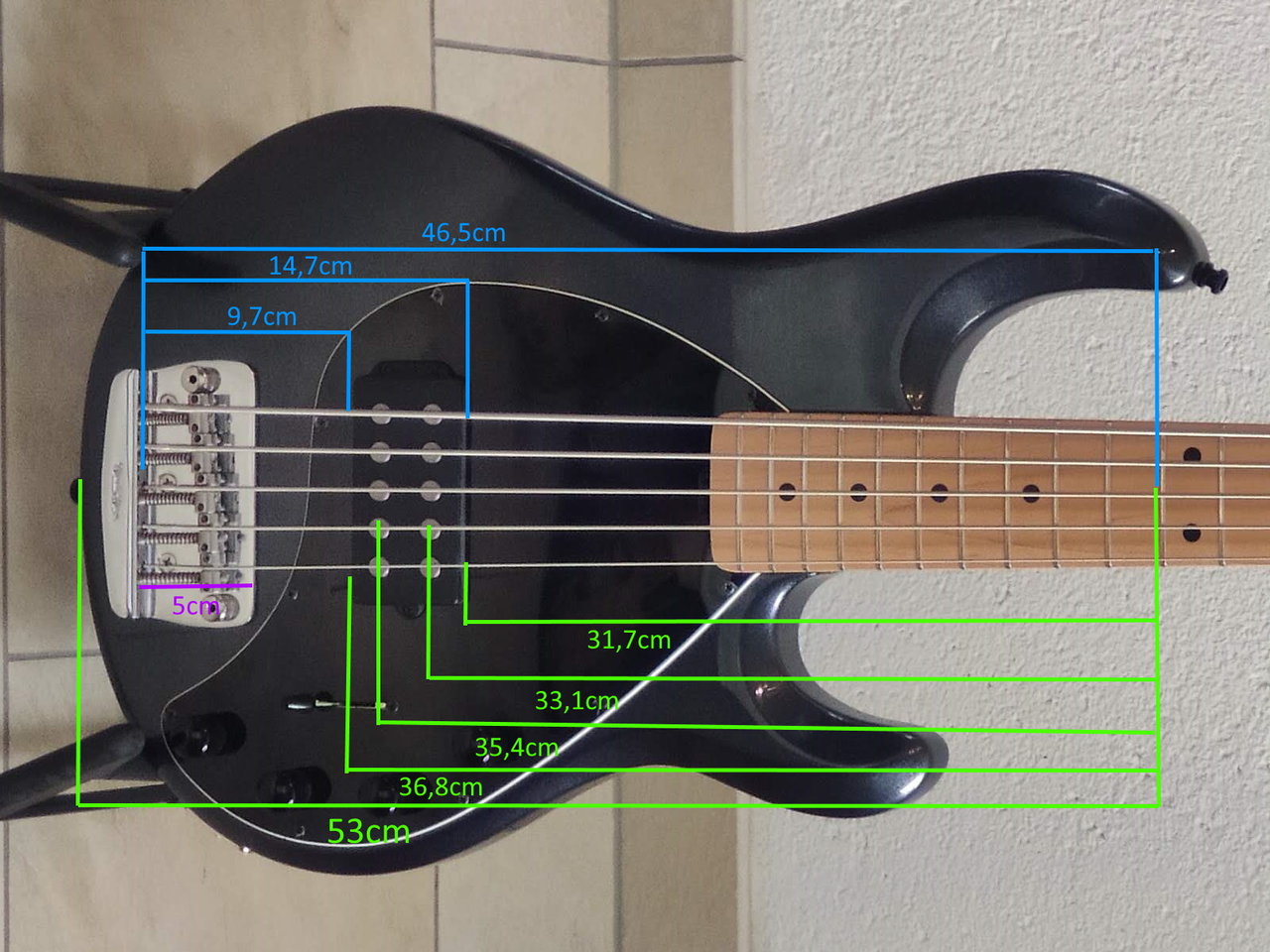 Die Maße sind vom Stingray5 H BJ 2009. Der 5er Special HH BJ 2019 sowie der 4-Saiter USA SUB haben identische Maße. Das einzige was sich unterscheidet ist die Korpuslänge. Hier 53cm ab 12. Bund, bei den anderen etwa 50cm