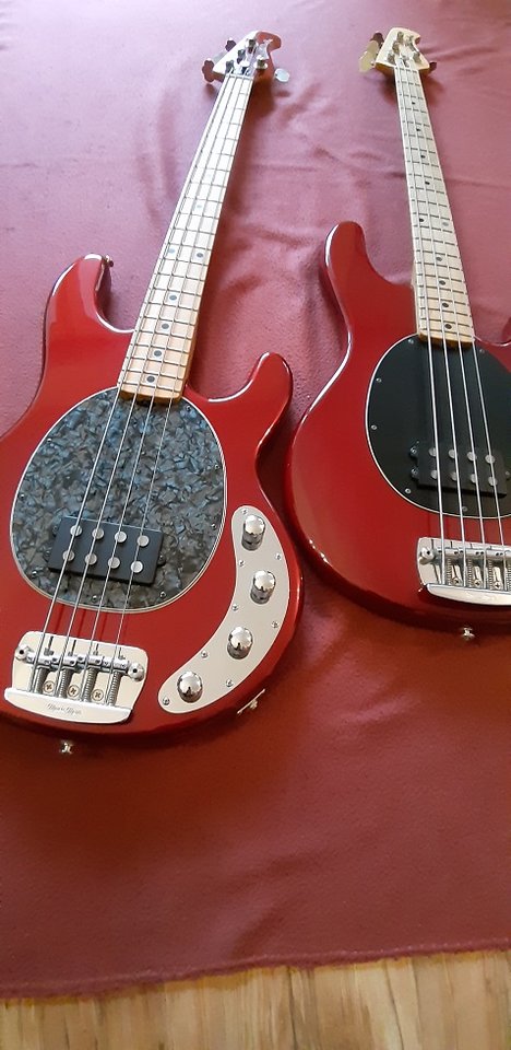 Hui, schönes DingWusste ich doch, dass da jemand daheim noch einen unbenutzten Stingray für mich übrig hat.... heute eingetrudelt - ein SR 4 in Candy-Apple-Red mit Matching-Headstock ... Baujahr 2000 ... 4 kg geradeaus ...3-Band-EQ ... typische 1990er Bauweise was Griffbrett und Halsrückseite betrifft ....