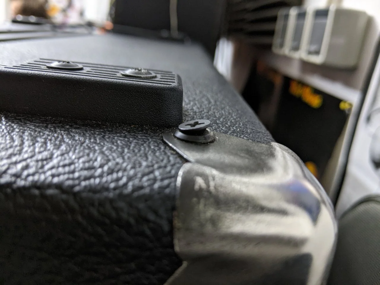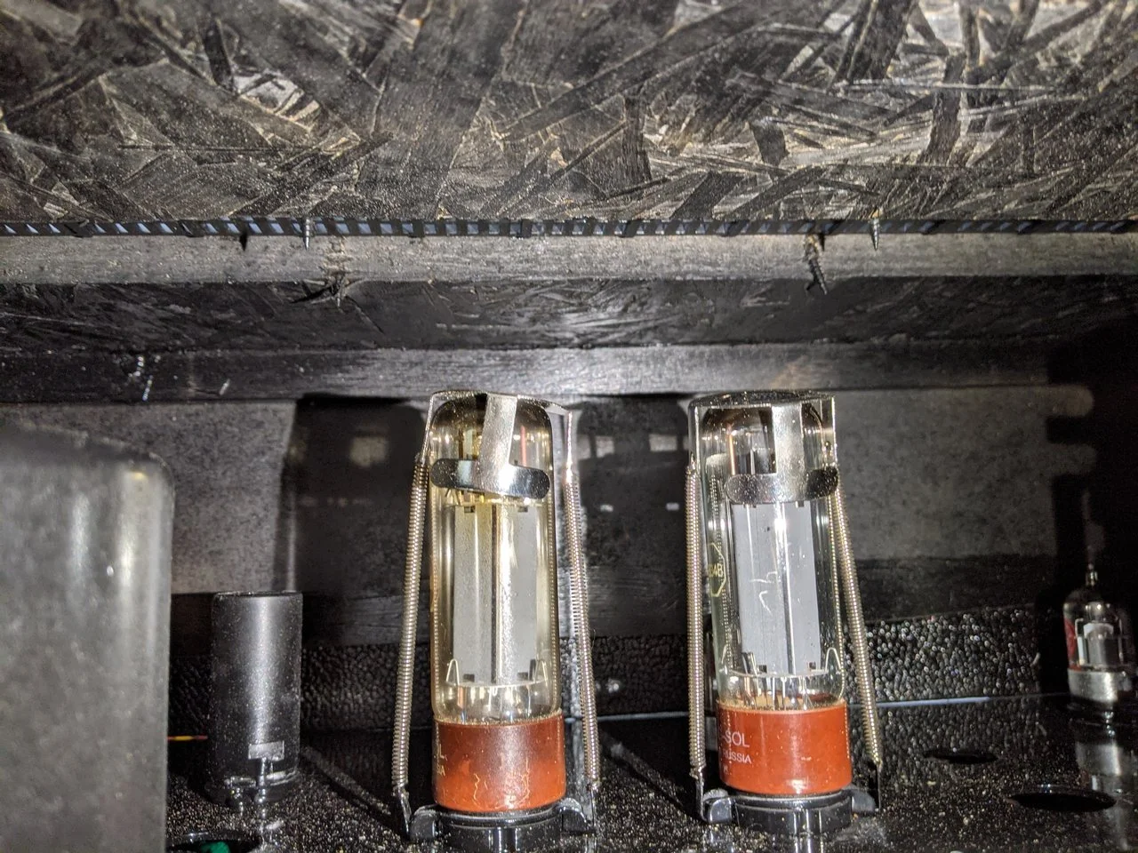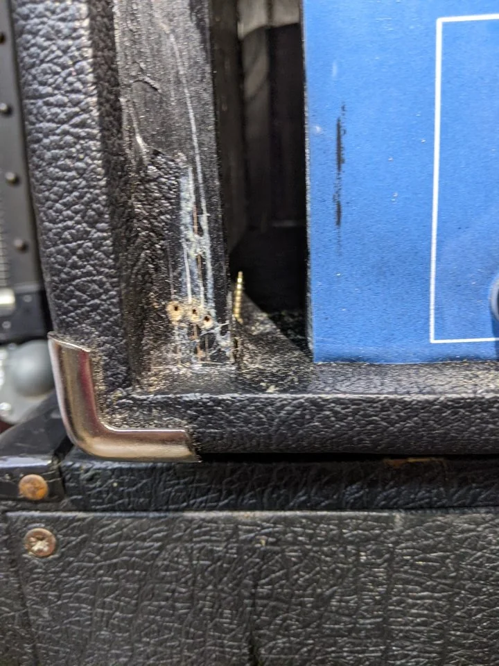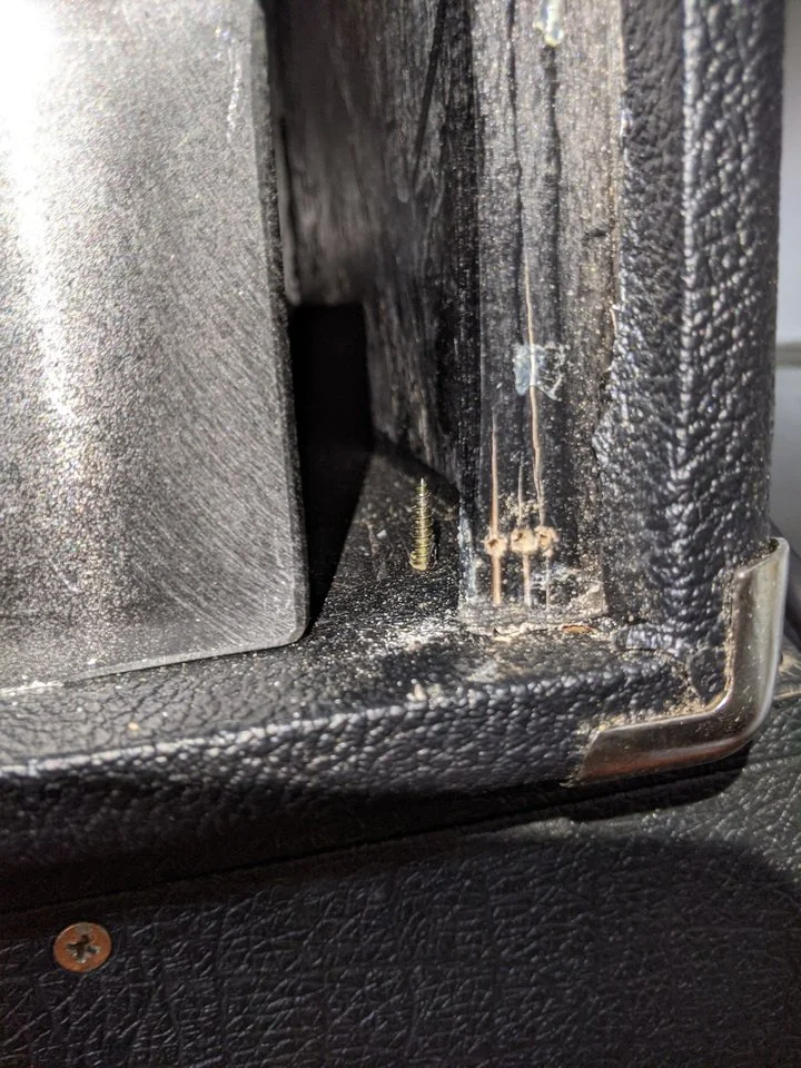 In der ersten Probe funktionierte der Amp eine Stunde, danach kam kein Piep mehr raus. Ich habe leider keine Fotos vom Innenleben aber dafür vom Gehäuse. Die Rückblende hat eine Passform jenseits von Gut und Böse, sämtliche Schrauben wurden ohne Vorbohren in das Multiplex geschraubt (dementsprechend gibts auch keine gerade Schraube). Die Vorderseite des Chassis hat Kratzer, an einigen Stellen ist ein schwarzer Farbfilm zu sehen, die Schrauben sind hier und da ein bunter Mix.