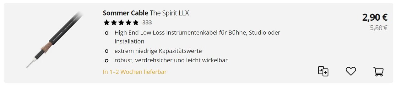 Sommer Cable The Spirit LLX, High End Low Loss Instrumentenkabel für Bühne, Studio oder Installation - extrem niedrige Kapazitätswerte, Robust, verdrehsicher und leicht wickelbar, verlustarme, detailreiche und neutrale Übertragungseigenschaften,...