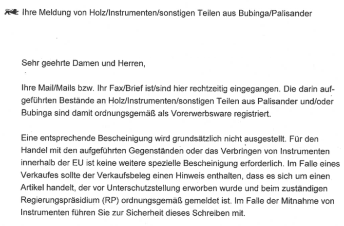 Ich hatte Ende 2016 eine Excelliste an das für mich zuständige Regierungspräsidium geschickt. Die kam abgestempelt zurück mit einem Schreiben, dass die entsprechenden Instrumente als Vorbesitz anerkannt sind. Und einem Formular, das ich ausfüllen und eventuellen Käufern zusammen mit einer Kopie der Liste mitgeben soll. D.h. ich als Verkäufer stehe dafür gerade, dass ich kein Rio verkaufe.Die Liste zeigt, dass der verbaute Palisander (spp., nicht Rio) als Vorbesitz anerkannt ist.Andere Richtung, ich hatte meine Bässe Ende 2016 hier beim Amt für den Bestandsschutz registriert, das wurde auch bestätigt. Da ich aus Platzmangel jetzt einen verkaufen möchte, habe ich die Woche um eine Vorerwerbsbescheinigung gebeten. Der zuständige Mitarbeiter ist sich aber über den Prozess nicht sicher und vermutet, daß er auch ein Gutachten braucht, welcher Palisandertyp (d.h. kein Dalbergia Nigra) verbaut ist, bevor er mir eine Bescheinigung ausstellen kann. Was aus meinen Verständnis für eine Vorerwerbsbestätigung nicht erforderlich ist,