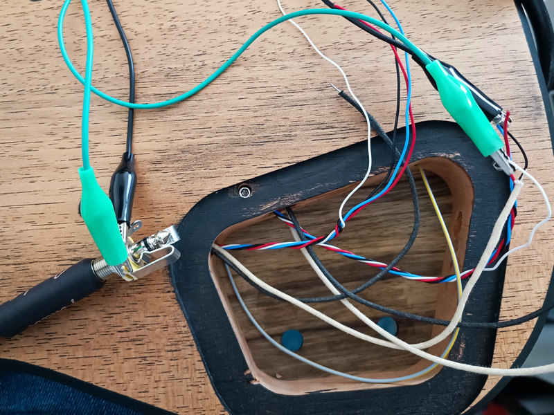 Die PUs sind Alnico 5 Modelle von AliEx, habe schon recht brauchbare Single Coils vom selben Shop auf einer Strat im Einsatz. Die PU Kappen haben oben nur noch knapp über 1mm Holz stehen, ich wollte die Pole nicht sehen.