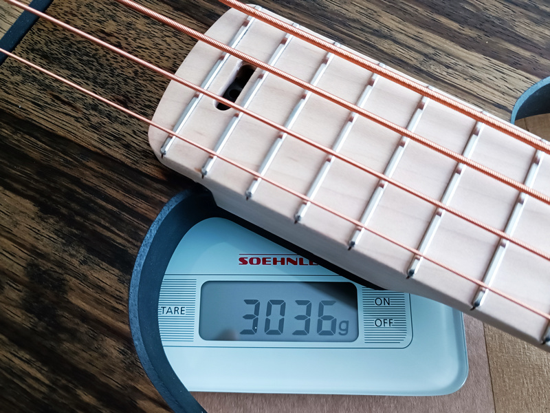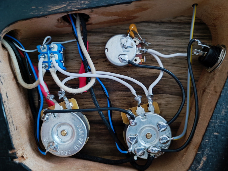 Finaltag. Heute kam die Elektronik dran. Nach einem schnellen Anspieltest aller PUs mit Krokoklemmen habe ich das ganze verlötet. Der interessierte Betrachter wird direkt die beiden Kondensatoren am Tone Poti entdecken. Meine Testreihe ergab, dass der Gerät durchaus 200nF verträgt. Ich hatte aber nur 100nF hier rumliegen, deshalb zwei parallel. Kurzversion: 2x500k Volume, 250k/200nF Tone und ein Humbucker/Singlecoil Mini-Toggleswitch. Gewichtsmäßig bin ich nur hauchdünn über den 3kg gelandet, das lief sogar besser als erwartet.