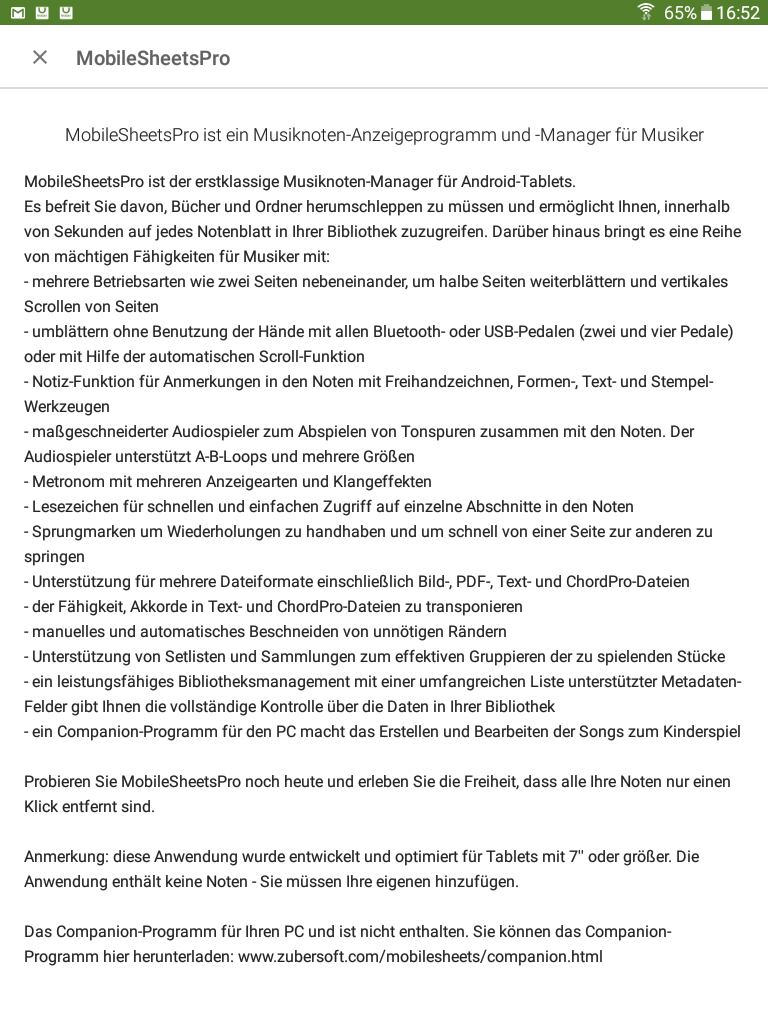 - Als Notenverwaltungsprogramm (zur Darstellung von Noten) nutze ich MobileSheets pro - das gibt es für IOS und Android, sowie auch für Windows. Damit lassen sich die Noten perfekt verwalten, man kann Setlists erstellen, Korrekturen an Helligkeit, Kontrast, Beschnitt vornehmen usw. und sogar mit der eingebauten Tablet-Kamera sich Noten mal schnell abfotografieren und ins Programm einspeisen (Achtung: Kopieren eigener Noten ist dazu erlaubt - nicht aber das Kopieren von nicht selbst erworben Noten). Dazu ist klasse, dass man die Dropbox als Sicherung einbinden kann. Ich hatte mal einen Tabletdefekt und konnte ratzfatz die Hardware tauschen und die Noten online mittels Tethering (Handy an Tablet koppeln, dann online gehen) rüberziehen.