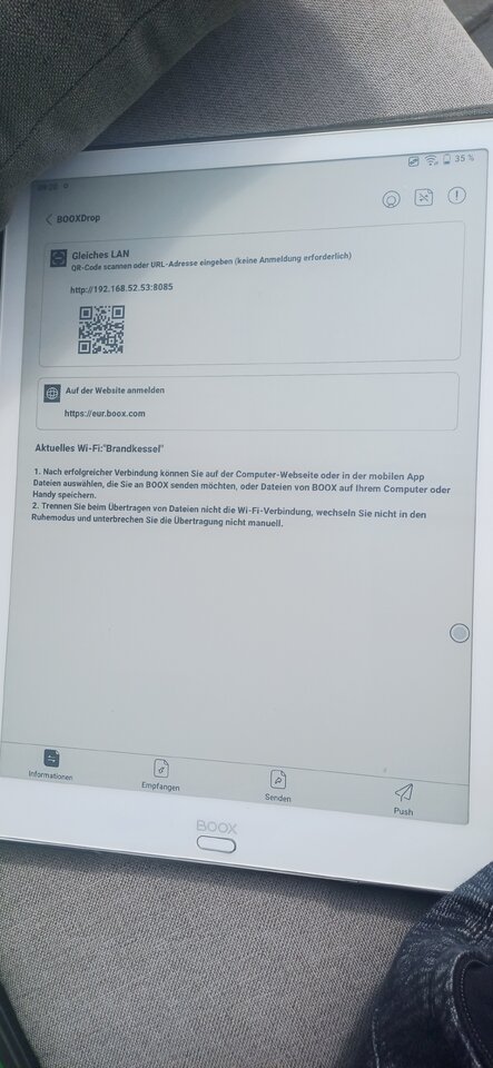 es gibt auch noch die boox drop funktion. Das ist extrem unompliziert und du sendest die dateien quasi über dein privates Netzwerk direkt ans gerät. Das geht auch vom Handy, oder von einem computer. So sie das bei mir dann aus: