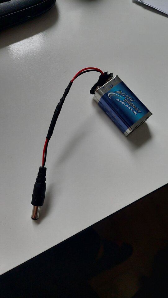 Mit 9V Batterieklemmen-Kabel auf den passender Stecker gelötet konnte ich das Ding auch ohne Netzteil wunderbar betreiben. Nur zeigt die LED nicht an, wenn die Batterie leer ist. Da kommt dann einfach nichts mehr raus und die Lampe leuchtet weiter.